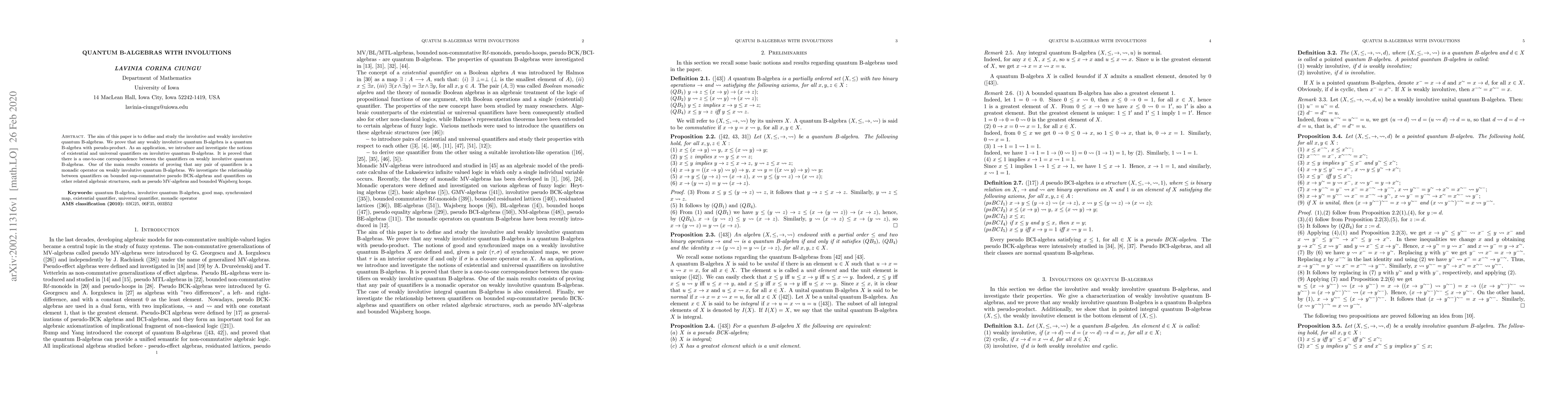 The aim of this paper is to define and study the involutive and weakly involutive quantum B-algebras. We prove that any weakly involutive quantum B-algebra is a quantum B-algebra with pseudo-product. As an application, we introduce and investigate the notions of existential and universal quantifiers on involutive quantum B-algebras. It is proved that there is a one-to-one correspondence between the quantifiers on weakly involutive quantum B-algebras. One of the main results consists of proving that any pair of quantifiers is a monadic operator on weakly involutive quantum B-algebras. We investigate the relationship between quantifiers on bounded sup-commutative pseudo BCK-algebras and quantifiers on other related algebraic structures, such as pseudo MV-algebras and bounded Wajsberg hoops.