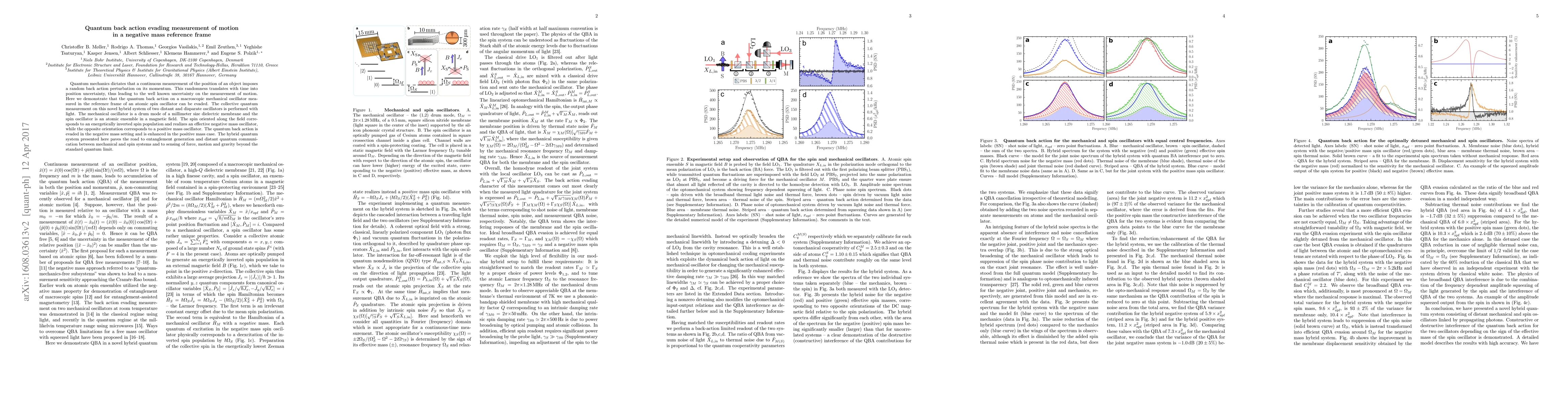 Quantum mechanics dictates that a continuous measurement of the position of an object imposes a random back action perturbation on its momentum. This randomness translates with time into position uncertainty, thus leading to the well known uncertainty on the measurement of motion. Here we demonstrate that the quantum back action on a macroscopic mechanical oscillator measured in the reference frame of an atomic spin oscillator can be evaded. The collective quantum measurement on this novel hybrid system of two distant and disparate oscillators is performed with light. The mechanical oscillator is a drum mode of a millimeter size dielectric membrane and the spin oscillator is an atomic ensemble in a magnetic field. The spin oriented along the field corresponds to an energetically inverted spin population and realizes an effective negative mass oscillator, while the opposite orientation corresponds to a positive mass oscillator. The quantum back action is evaded in the negative mass setting and is enhanced in the positive mass case. The hybrid quantum system presented here paves the road to entanglement generation and distant quantum communication between mechanical and spin systems and to sensing of force, motion and gravity beyond the standard quantum limit.