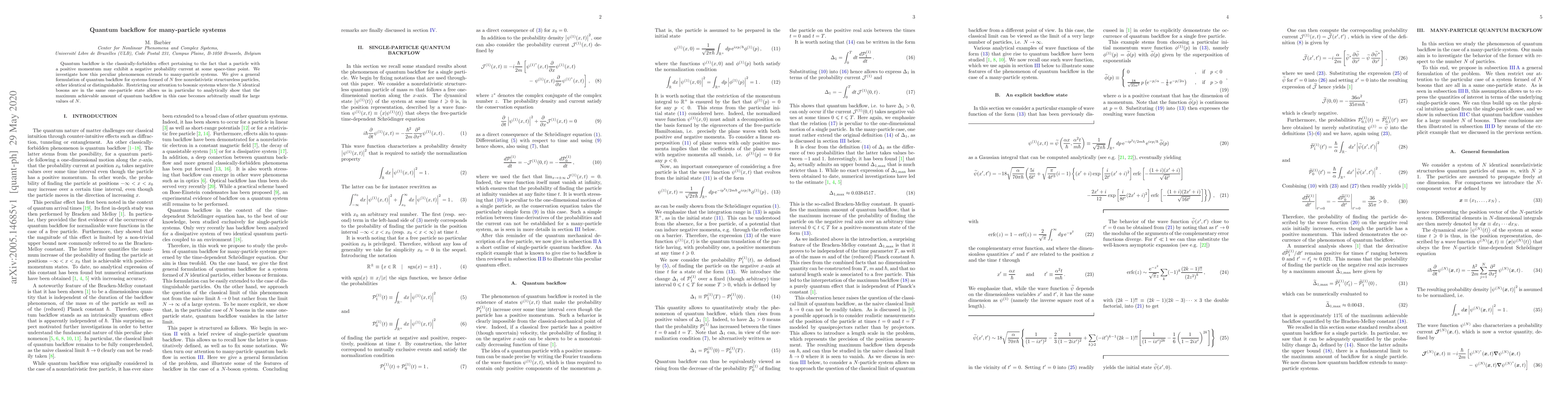 Quantum backflow is the classically-forbidden effect pertaining to the fact that a particle with a positive momentum may exhibit a negative probability current at some space-time point. We investigate how this peculiar phenomenon extends to many-particle systems. We give a general formulation of quantum backflow for systems formed of $N$ free nonrelativistic structureless particles, either identical or distinguishable. Restricting our attention to bosonic systems where the $N$ identical bosons are in the same one-particle state allows us in particular to analytically show that the maximum achievable amount of quantum backflow in this case becomes arbitrarily small for large values of $N$.