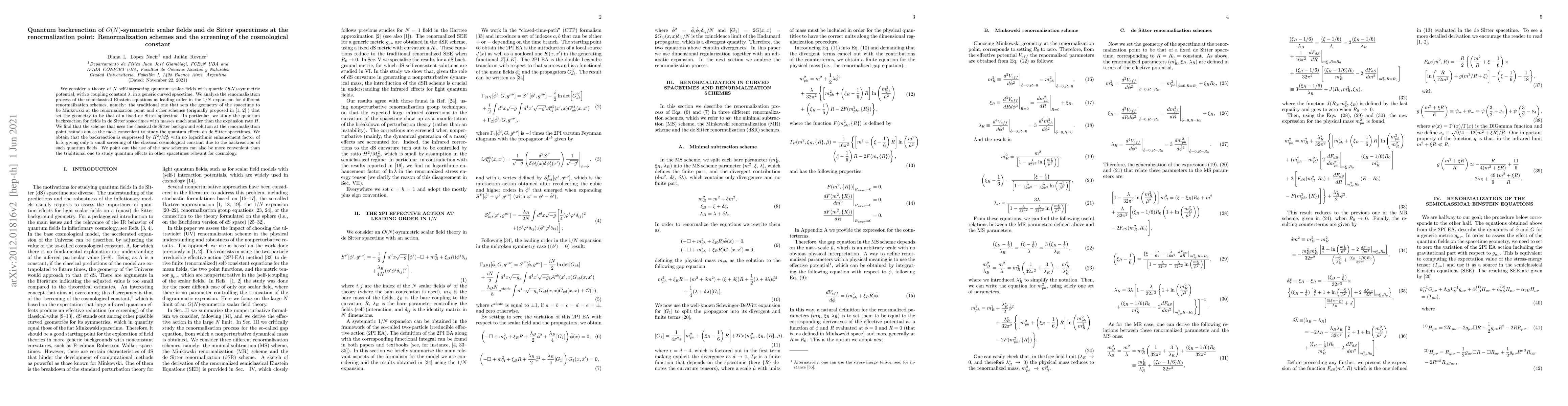 We consider a theory of $N$ self-interacting quantum scalar fields with quartic $O(N)$-symmetric potential, with a coupling constant $\lambda$, in a generic curved spacetime. We analyze the renormalization process of the Semiclassical Einstein Equations at leading order in the $1/N$ expansion for different renormailzation schemes, namely: the traditional one that sets the geometry of the spacetime to be Minkowski at the renormalization point, and new schemes (originally proposed in [1,2]) which set the geometry to be that of a fixed de Sitter spacetime. In particular, we study the quantum backreaction for fields in de Sitter spacetimes with masses much smaller than the expansion rate $H$. We find that the scheme that uses the classical de Sitter background solution at the renormalization point, stands out as the most appropriate to study the quantum effects on de Sitter spacetimes. Adopting such scheme we obtain the backreaction is suppressed by $H^2/M_{pl}^2$ with no logarithmic enhancement factor of $\ln{\lambda}$, giving only a small screening of the classical cosmological constant due to the backreaction of such quantum fields. We point out the use of the new schemes can also be more appropriate than the traditional one to study quantum effects in other spacetimes relevant for cosmology.