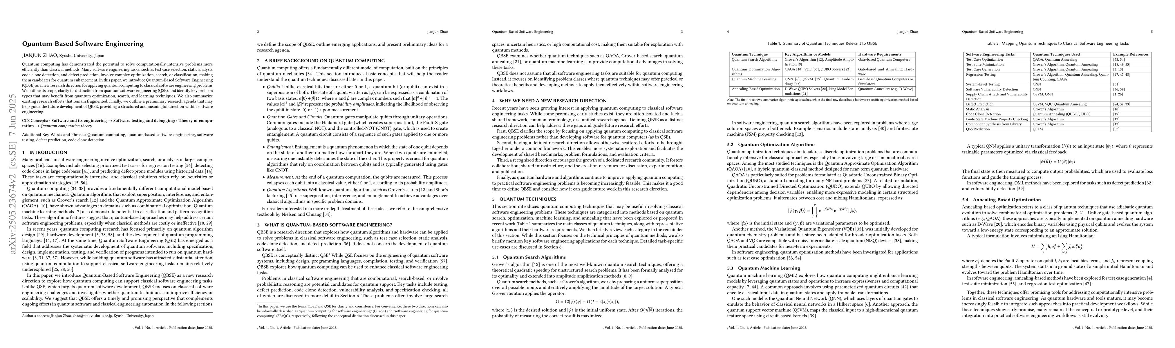 The paper proposes Quantum-Based Software Engineering (QBSE) as a research direction, focusing on applying quantum computing techniques to classical software engineering problems. It outlines the scope of QBSE, distinguishes it from Quantum Software Engineering (QSE), and identifies key problem types suitable for quantum optimization, search, and learning techniques.