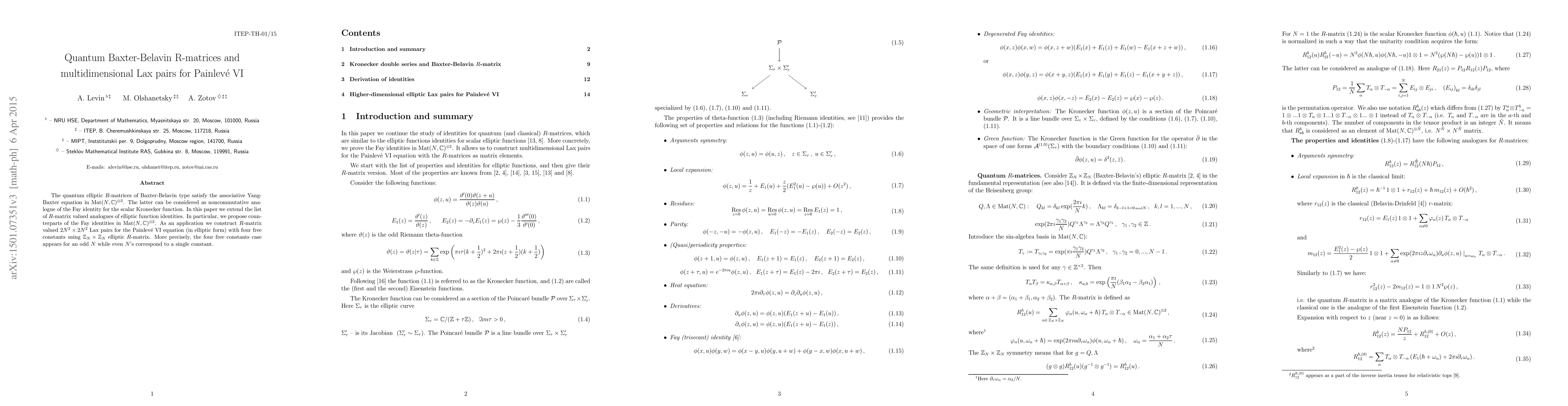 The quantum elliptic $R$-matrices of Baxter-Belavin type satisfy the associative Yang-Baxter equation in ${\rm Mat}(N,\mathbb C)^{\otimes 3}$. The latter can be considered as noncommutative analogue of the Fay identity for the scalar Kronecker function. In this paper we extend the list of $R$-matrix valued analogues of elliptic function identities. In particular, we propose counterparts of the Fay identities in ${\rm Mat}(N,\mathbb C)^{\otimes 2}$. As an application we construct $R$-matrix valued $2N^2\times 2N^2$ Lax pairs for the Painlev\'e VI equation (in elliptic form) with four free constants using ${\mathbb Z}_N\times {\mathbb Z}_N$ elliptic $R$-matrix. More precisely, the four free constants case appears for an odd $N$ while even $N$'s correspond to a single constant.