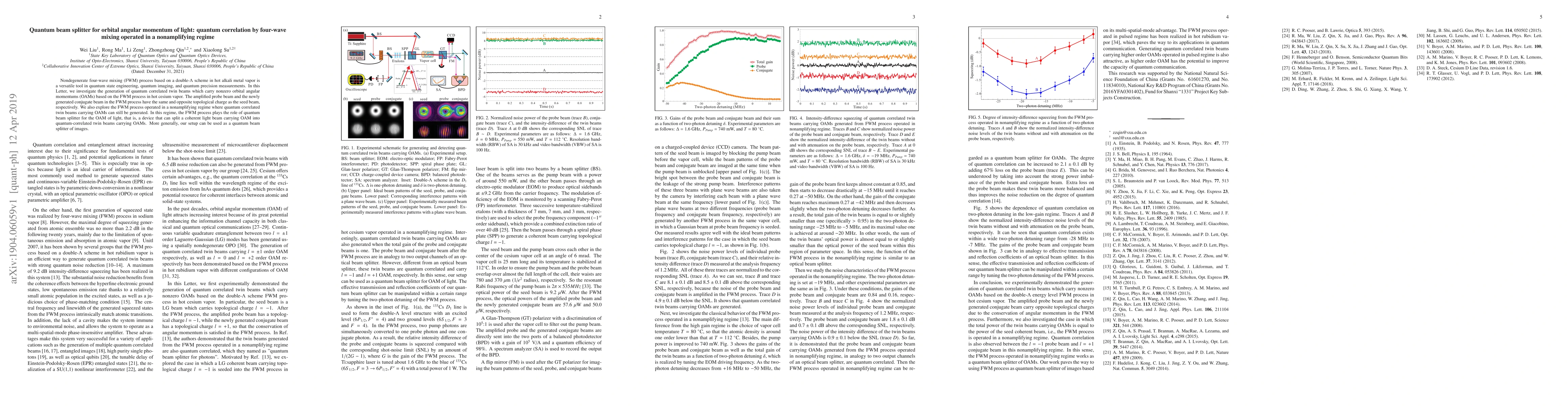 This paper explores the generation of quantum correlated twin beams with orbital angular momentum via nondegenerate four-wave mixing in hot cesium vapor, demonstrating the process's role as a quantum beam splitter for light's OAM, even in a nonamplifying regime. The setup can also function as a quantum beam splitter for images.