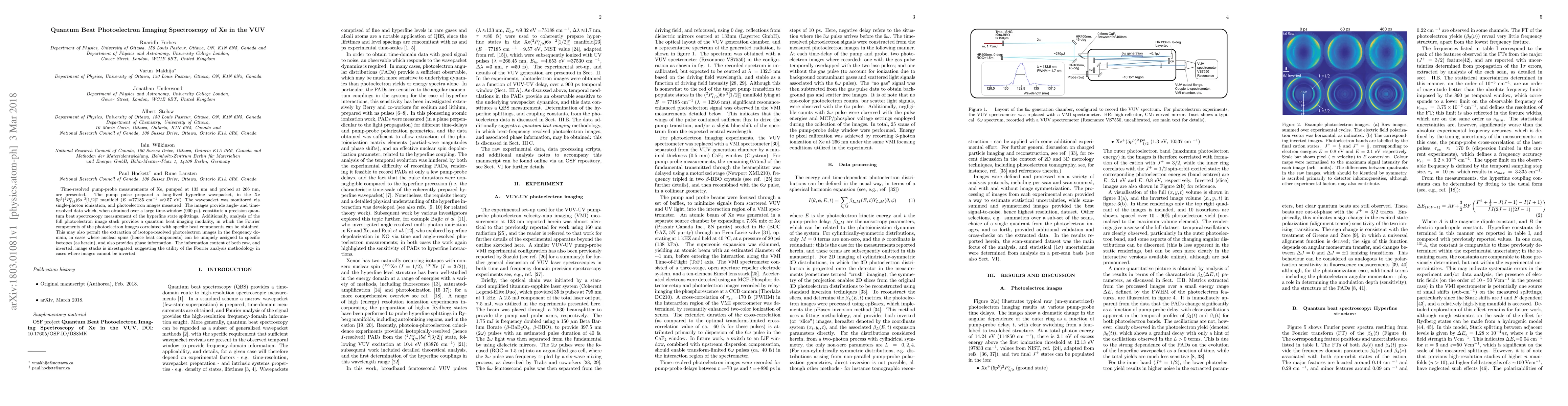 Time-resolved pump-probe measurements of Xe, pumped at 133~nm and probed at 266~nm, are presented. The pump pulse prepared a long-lived hyperfine wavepacket, in the Xe $5p^5(^2P^{\circ}_{1/2})6s~^2[1/2]^{\circ}_1$ manifold ($E=$77185 cm$^{-1}=$9.57 eV). The wavepacket was monitored via single-photon ionization, and photoelectron images measured. The images provide angle- and time-resolved data which, when obtained over a large time-window (900~ps), constitute a precision quantum beat spectroscopy measurement of the hyperfine state splittings. Additionally, analysis of the full photoelectron image stack provides a quantum beat imaging modality, in which the Fourier components of the photoelectron images correlated with specific beat components can be obtained. This may also permit the extraction of isotope-resolved photoelectron images in the frequency domain, in cases where nuclear spins (hence beat components) can be uniquely assigned to specific isotopes (as herein), and also provides phase information. The information content of both raw, and inverted, image stacks is investigated, suggesting the utility of the Fourier analysis methodology in cases where images cannot be inverted.