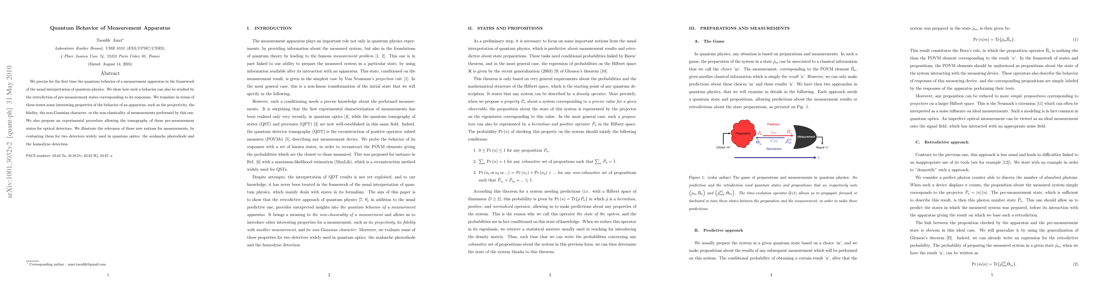 We precise for the first time the quantum behavior of a measurement apparatus in the framework of the usual interpretation of quantum physics. We show how such a behavior can also be studied by the retrodiction of pre-measurement states corresponding to its responses. We translate in terms of these states some interesting properties of the behavior of an apparatus, such as the projectivity, the fidelity, the non-Gaussian character, or the non-classicality of measurements performed by this one. We also propose an experimental procedure allowing the tomography of these pre-measurement states for optical detectors. We illustrate the relevance of these new notions for measurements, by evaluating them for two detectors widely used in quantum optics: the avalanche photodiode and the homodyne detection.