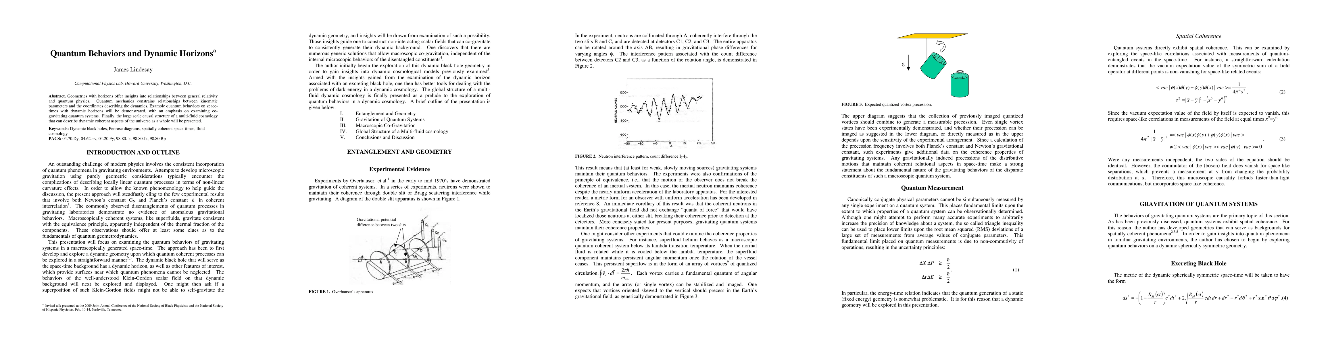 Geometries with horizons offer insights into relationships between general relativity and quantum physics. Quantum mechanics constrains relationships between kinematic parameters and the coordinates describing the dynamics. Example quantum behaviors on space-times with dynamic horizons will be demonstrated, with an emphasis on examining co-gravitating quantum systems. Finally, the large scale causal structure of a multi-fluid cosmology that can describe dynamic coherent aspects of the universe as a whole will be presented.