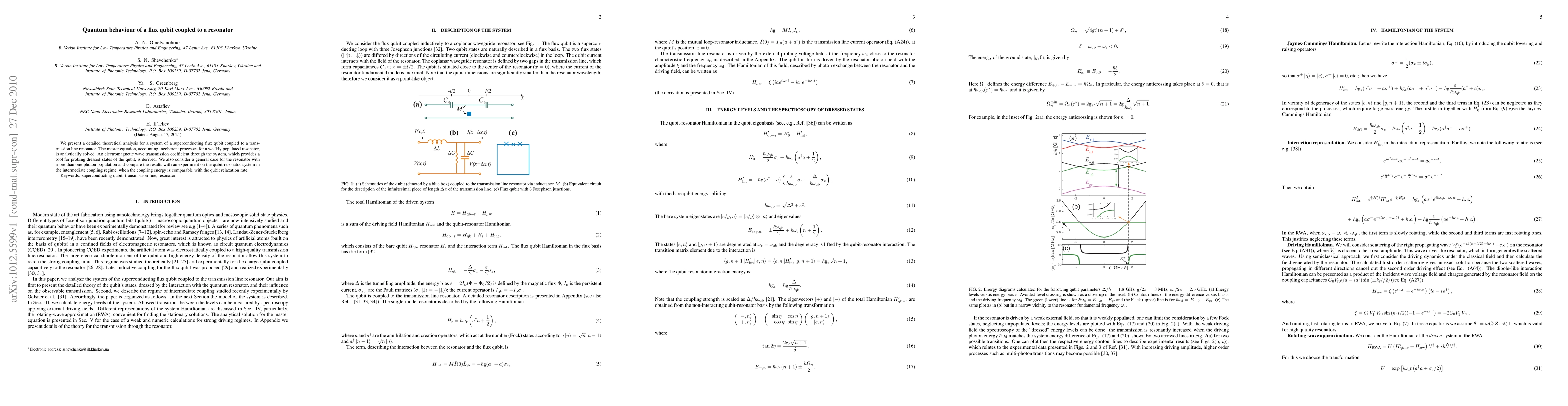 This paper theoretically analyzes a superconducting flux qubit coupled to a transmission line resonator, solving the master equation to account for incoherent processes. It derives a transmission coefficient for electromagnetic waves to probe the qubit's dressed states and compares theoretical results with experimental data in the intermediate coupling regime.
