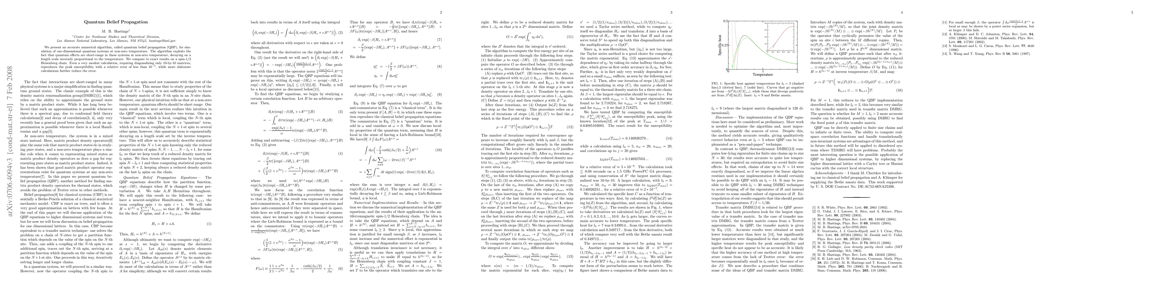 The paper introduces quantum belief propagation (QBP), a numerical algorithm for simulating one-dimensional quantum systems at non-zero temperature, showing high accuracy by comparing to exact results on a spin-1/2 Heisenberg chain. Even simple calculations using 10-by-10 matrices achieve a relative error below $10^{-5}$.