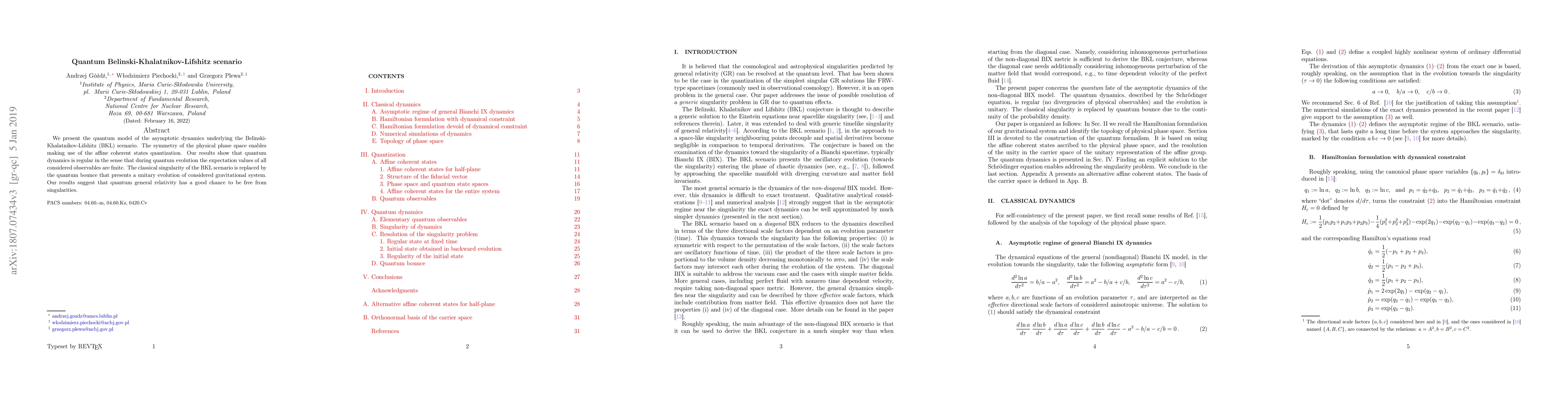 We present the quantum model of the asymptotic dynamics underlying the Belinski-Khalatnikov-Lifshitz (BKL) scenario. The symmetry of the physical phase space enables making use of the affine coherent states quantization. Our results show that quantum dynamics is regular in the sense that during quantum evolution the expectation values of all considered observables are finite. The classical singularity of the BKL scenario is replaced by the quantum bounce that presents a unitary evolution of considered gravitational system. Our results suggest that quantum general relativity is free from singularities.