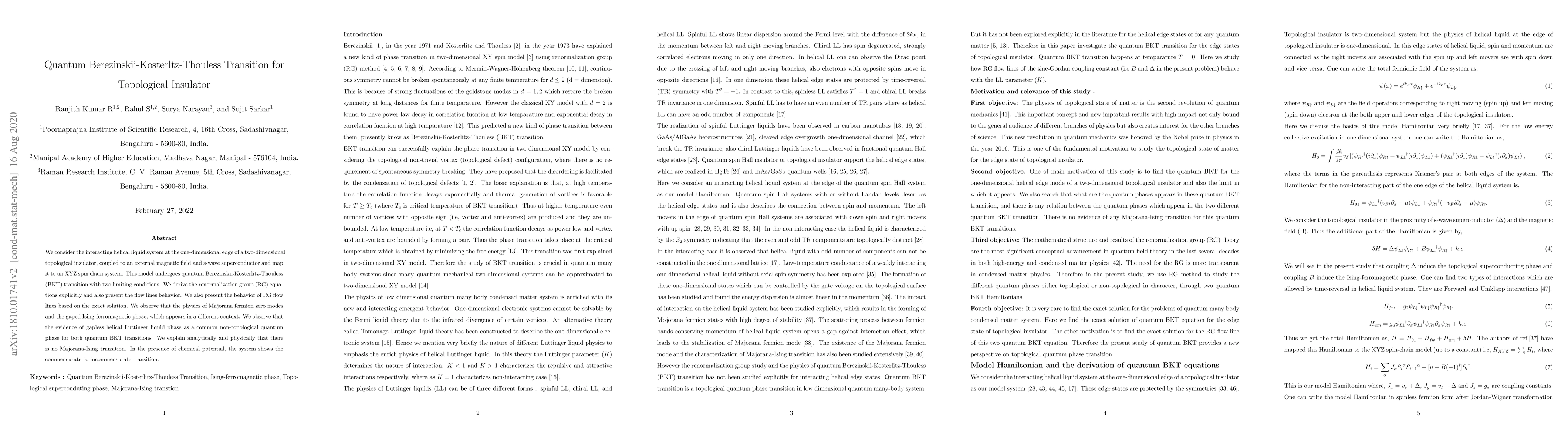 We consider the interacting helical liquid system at the one-dimensional edge of a two-dimensional topological insulator, coupled to an external magnetic field and s-wave superconductor and map it to an XYZ spin chain system. This model undergoes quantum Berezinskii-Kosterlitz-Thouless (BKT) transition with two limiting conditions. We derive the renormalization group (RG) equations explicitly and also present the flow lines behavior. We also present the behavior of RG flow lines based on the exact solution. We observe that the physics of Majorana fermion zero modes and the gaped Ising-ferromagnetic phase, which appears in a different context. We observe that the evidence of gapless helical Luttinger liquid phase as a common non-topological quantum phase for both quantum BKT transitions. We explain analytically and physically that there is no Majorana-Ising transition. In the presence of chemical potential, the system shows the commensurate to incommensurate transition.