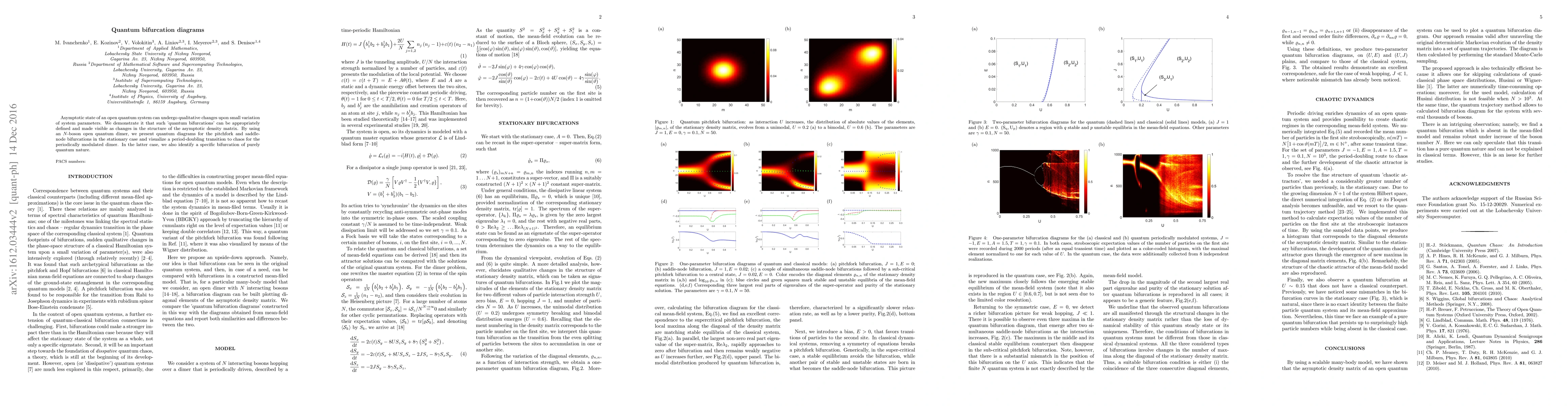 Asymptotic state of an open quantum system can undergo qualitative changes upon small variation of system parameters. We demonstrate it that such 'quantum bifurcations' can be appropriately defined and made visible as changes in the structure of the asymptotic density matrix. By using an $N$-boson open quantum dimer, we present quantum diagrams for the pitchfork and saddle-node bifurcations in the stationary case and visualize a period-doubling transition to chaos for the periodically modulated dimer. In the latter case, we also identify a specific bifurcation of purely quantum nature.