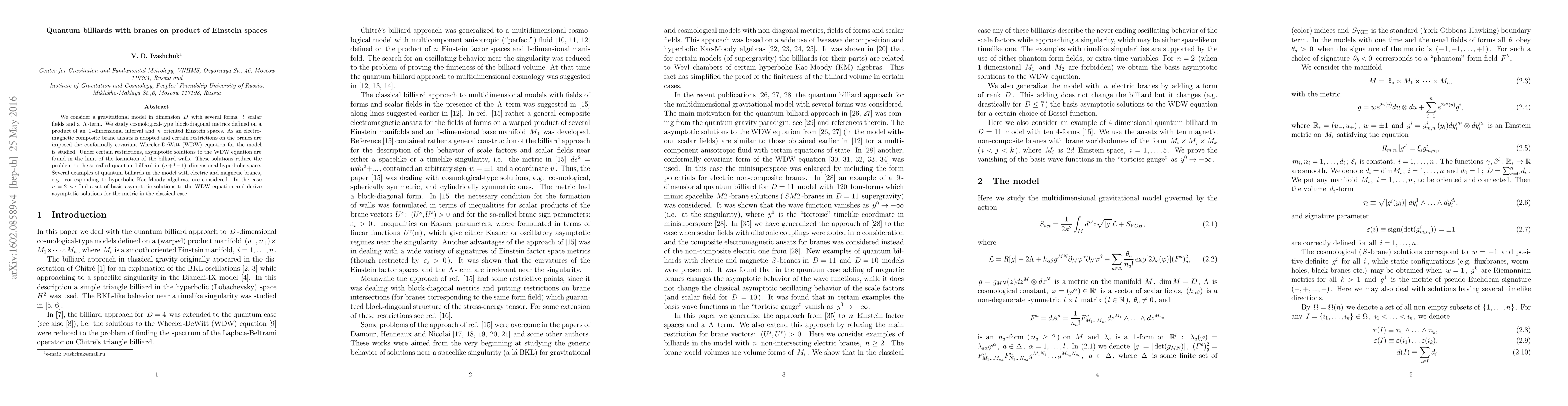 We consider a gravitational model in dimension D with several forms, l scalar fields and a Lambda-term. We study cosmological-type block-diagonal metrics defined on a product of an 1-dimensional interval and n oriented Einstein spaces. As an electromagnetic composite brane ansatz is adopted and certain restrictions on the branes are imposed the conformally covariant Wheeler-DeWitt (WDW) equation for the model is studied. Under certain restrictions, asymptotic solutions to the WDW equation are found in the limit of the formation of the billiard walls. These solutions reduce the problem to the so-called quantum billiard in (n + l - 1)-dimensional hyperbolic space. Several examples of quantum billiards in the model with electric and magnetic branes, e.g. corresponding to hyperbolic Kac-Moody algebras, are considered. In the case n=2 we find a set of basis asymptotic solutions to the WDW equation and derive asymptotic solutions for the metric in the classical case.
