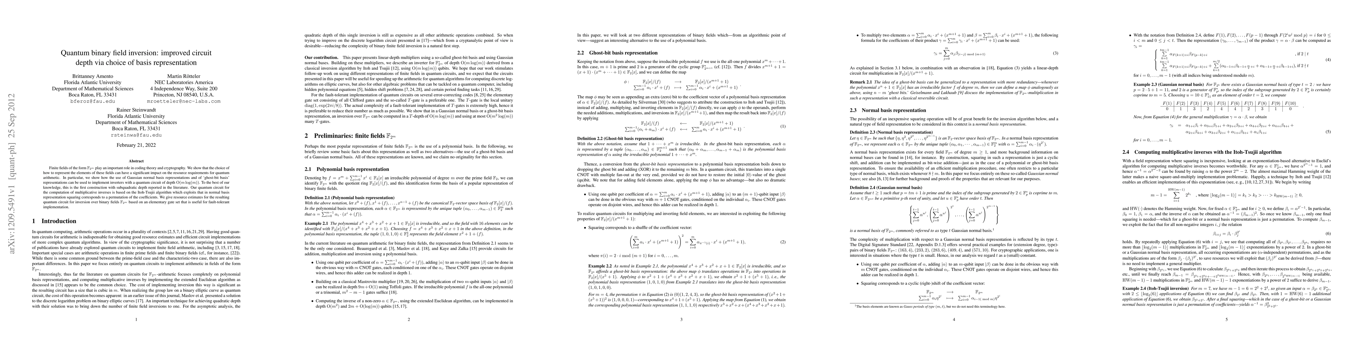 This paper demonstrates that using Gaussian normal basis and ghost-bit basis representations can significantly reduce the quantum circuit depth for binary field inversion to O(m log(m)), a subquadratic improvement. The proposed quantum circuit for multiplicative inverses over GF(2^m) leverages the Itoh-Tsujii algorithm and is designed for fault-tolerant implementation.