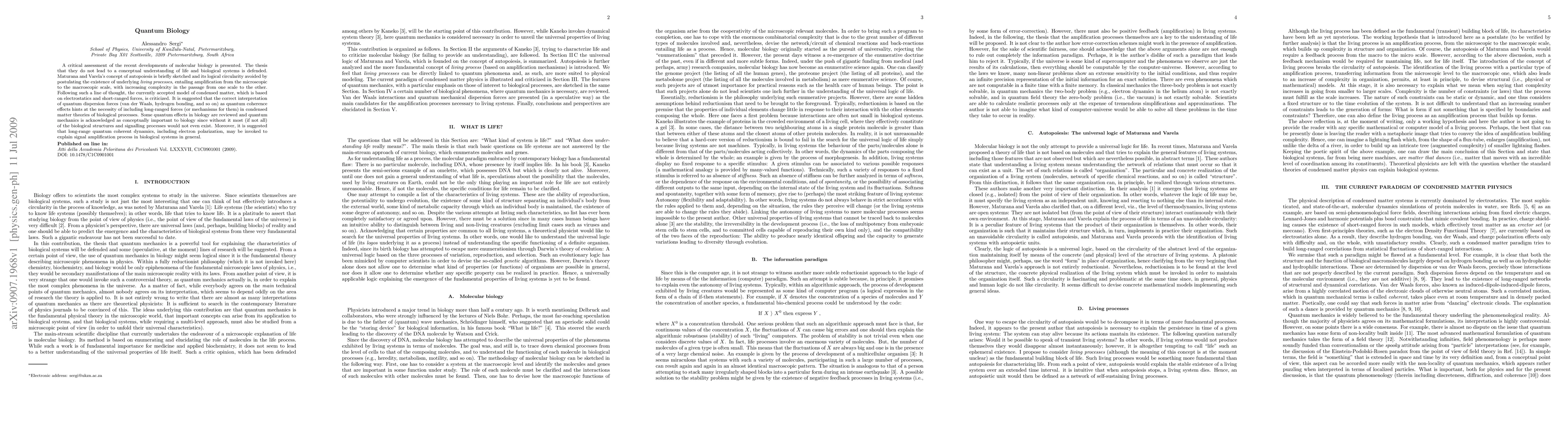 A research paper explores the intersection of quantum mechanics and biology, suggesting that long-range quantum forces may explain biological signal amplification and criticizing current condensed matter theories. It argues that quantum coherence is essential for understanding biological structures and signaling processes.