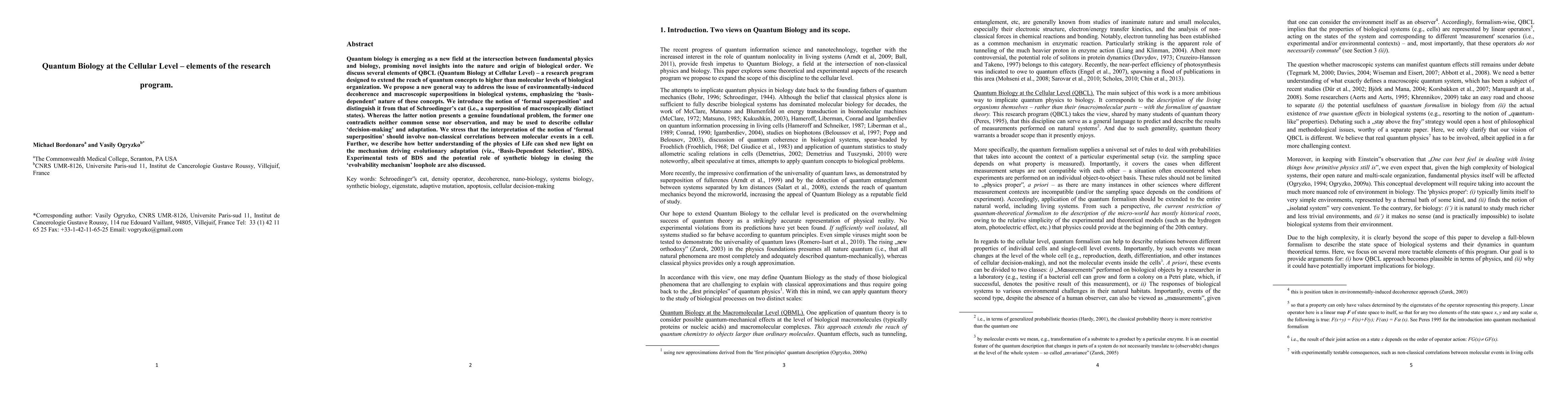 Quantum Biology is emerging as a new field at the intersection between fundamental physics and biology, promising novel insights into the nature and origin of biological order. We discuss several elements of QBCL (Quantum Biology at Cellular Level), a research program designed to extend the reach of quantum concepts to higher than molecular levels of biological organization. Key words. decoherence, macroscopic superpositions, basis-dependence, formal superposition, non-classical correlations, Basis-Dependent Selection (BDS), synthetic biology, evolvability mechanism loophole.