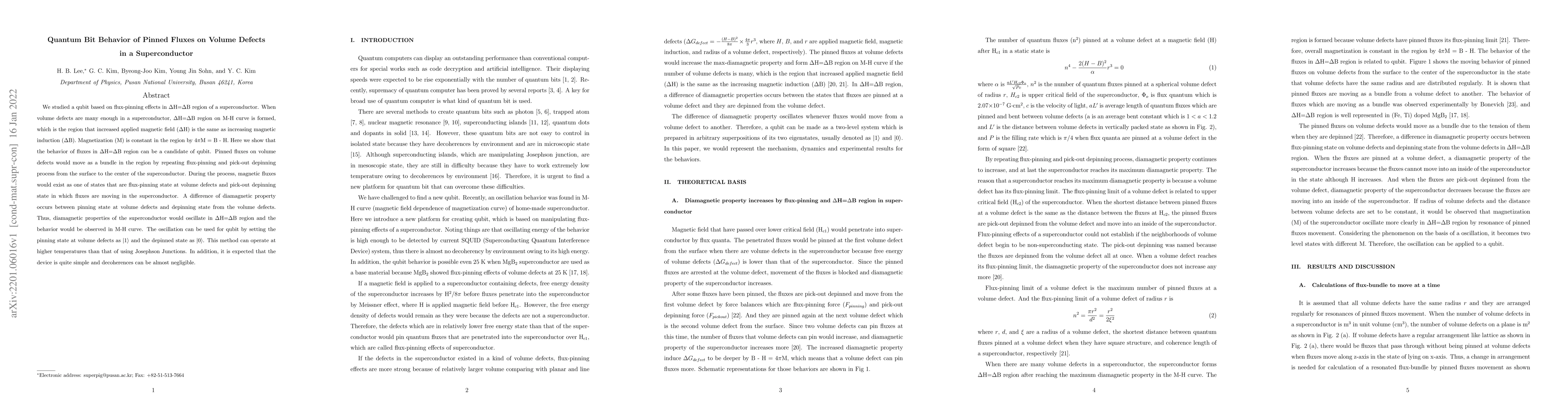 We studied a qubit based on flux-pinning effects in $\Delta$H=$\Delta$B region of a superconductor. When volume defects are many enough in a superconductor, $\Delta$H=$\Delta$B region on M-H curve is formed, which is the region that increased applied magnetic field ($\Delta$H) is the same as increasing magnetic induction ($\Delta$B). Magnetization (M) is constant in the region by 4$\pi$M = B - H. Here we show that the behavior of fluxes in $\Delta$H=$\Delta$B region can be a candidate of qubit. Pinned fluxes on volume defects would move as a bundle in the region by repeating flux-pinning and pick-out depinning process from the surface to the center of the superconductor. During the process, magnetic fluxes would exist as one of states that are flux-pinning state at volume defects and pick-out depinning state in which fluxes are moving in the superconductor. A difference of diamagnetic property occurs between pinning state at volume defects and depinning state from the volume defects. Thus, diamagnetic properties of the superconductor would oscillate in $\Delta$H=$\Delta$B region and the behavior would be observed in M-H curve. The oscillation can be used for qubit by setting the pinning state at volume defects as $\ket{1}$ and the depinned state as $\ket{0}$. This method can operate at higher temperatures than that of using Josephson Junctions. In addition, it is expected that the device is quite simple and decoherences can be almost negligible.