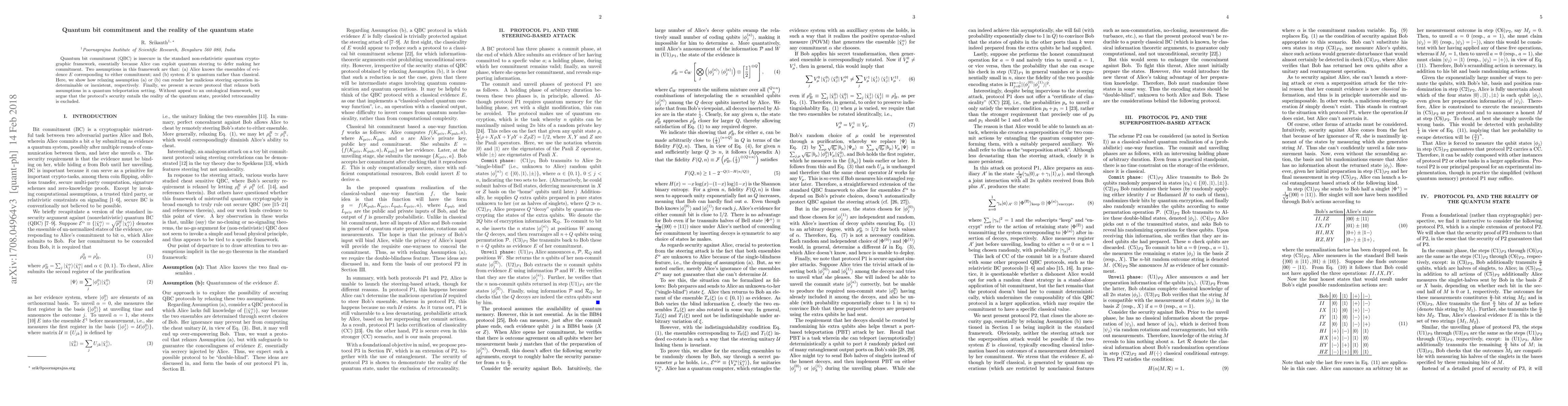 Quantum bit commitment (QBC) is insecure in the standard non-relativistic quantum cryptographic framework, essentially because Alice can exploit quantum steering to defer making her commitment. Two assumptions in this framework are that: (a) Alice knows the ensembles of evidence $E$ corresponding to either commitment; and (b) system $E$ is quantum rather than classical. Here, we show how relaxing assumption (a) or (b) can render her malicious steering operation indeterminable or inexistent, respectively. Finally, we present a secure protocol that relaxes both assumptions in a quantum teleportation setting. Without appeal to an ontological framework, we argue that the protocol's security entails the reality of the quantum state, provided retrocausality is excluded.