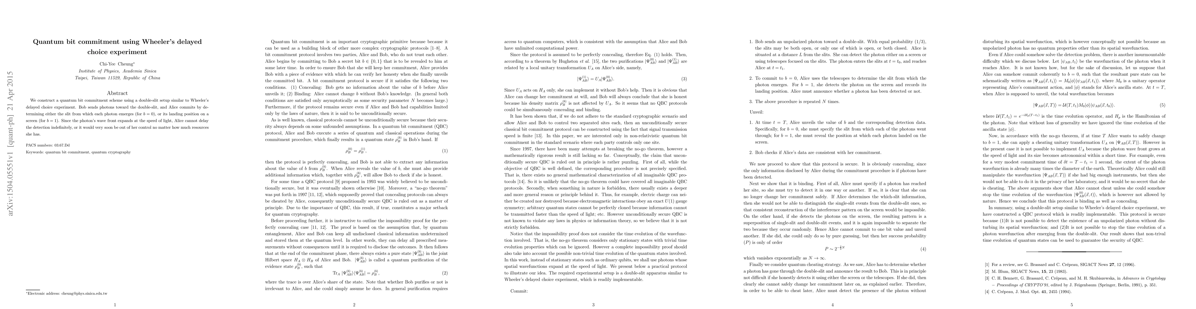 A double-slit setup similar to Wheeler's delayed choice experiment was used to construct a quantum bit commitment scheme.