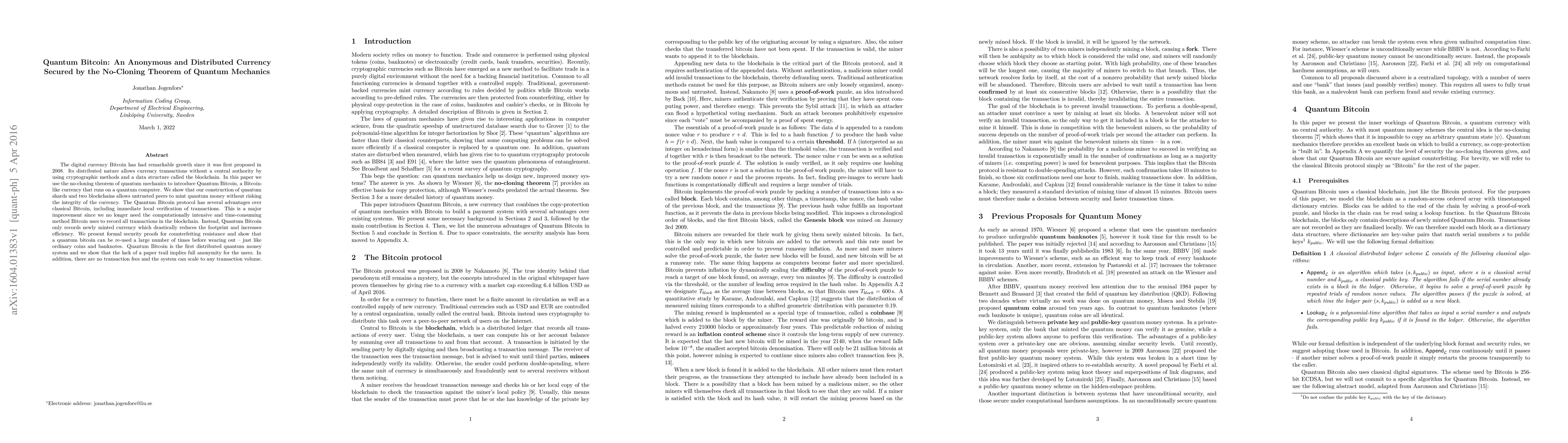 Quantum Bitcoin leverages the no-cloning theorem of quantum mechanics to create a secure, anonymous, and efficient distributed currency. Unlike classical Bitcoin, it uses quantum shards and two blockchains for immediate local verification, reducing computational overhead and increasing scalability.