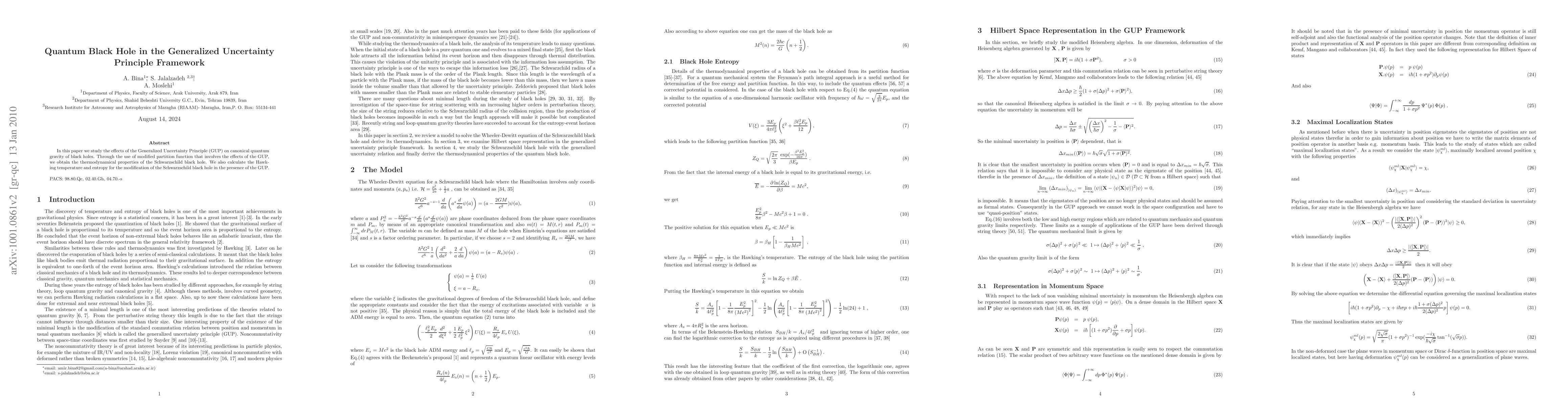 This paper investigates the impact of the Generalized Uncertainty Principle (GUP) on quantum gravity and black hole thermodynamics, deriving modified thermodynamic properties, including Hawking temperature and entropy, for a Schwarzschild black hole.