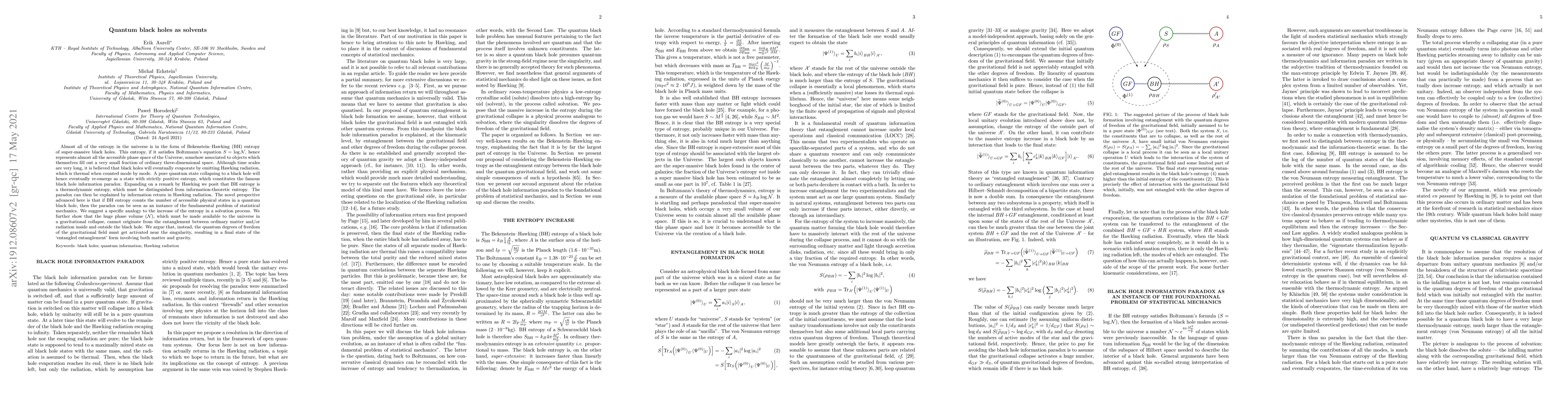 Almost all of the entropy in the universe is in the form of Bekenstein--Hawking (BH) entropy of super-massive black holes. This entropy, if it satisfies Boltzmann's equation $S=\log{\cal N}$, hence represents almost all the accessible phase space of the Universe, somehow associated to objects which themselves fill out a very small fraction of ordinary three-dimensional space. Although time scales are very long, it is believed that black holes will eventually evaporate by emitting Hawking radiation, which is thermal when counted mode by mode. A pure quantum state collapsing to a black hole will hence eventually re-emerge as a state with strictly positive entropy, which constitutes the famous black hole information paradox. Expanding on a remark by Hawking we posit that BH entropy is a thermodynamic entropy, which must be distinguished from information-theoretic entropy. The paradox can then be explained by information return in Hawking radiation. The novel perspective advanced here is that if BH entropy counts the number of accessible physical states in a quantum black hole, then the paradox can be seen as an instance of the fundamental problem of statistical mechanics. We suggest a specific analogy to the increase of the entropy in a solvation process. We further show that the huge phase volume (${\cal N}$), which must be made available to the universe in a gravitational collapse, cannot originate from the entanglement between ordinary matter and/or radiation inside and outside the black hole. We argue that, instead, the quantum degrees of freedom of the gravitational field must get activated near the singularity, resulting in a final state of the `entangled entanglement' form involving both matter and gravity.