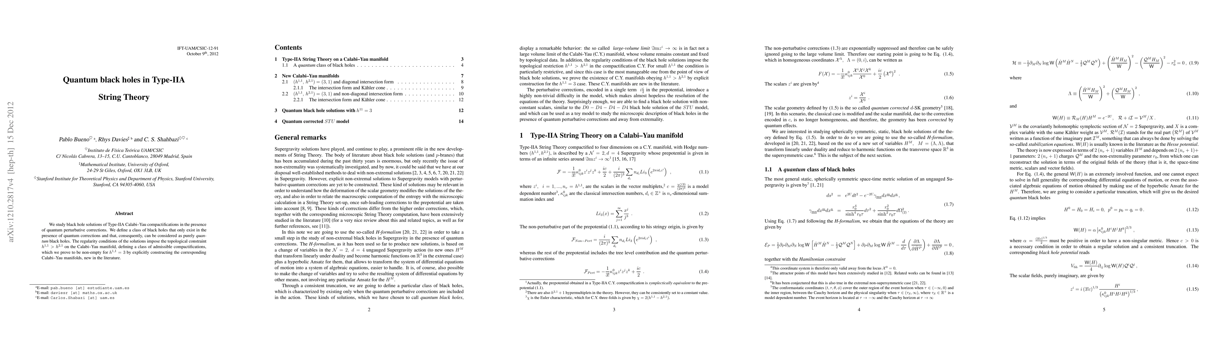 This research explores black hole solutions in Type-IIA string theory with perturbative quantum corrections, identifying a class of purely quantum black holes. It establishes a topological constraint and proves the existence of admissible compactifications with h^{1,1}=3 by constructing new Calabi-Yau manifolds.