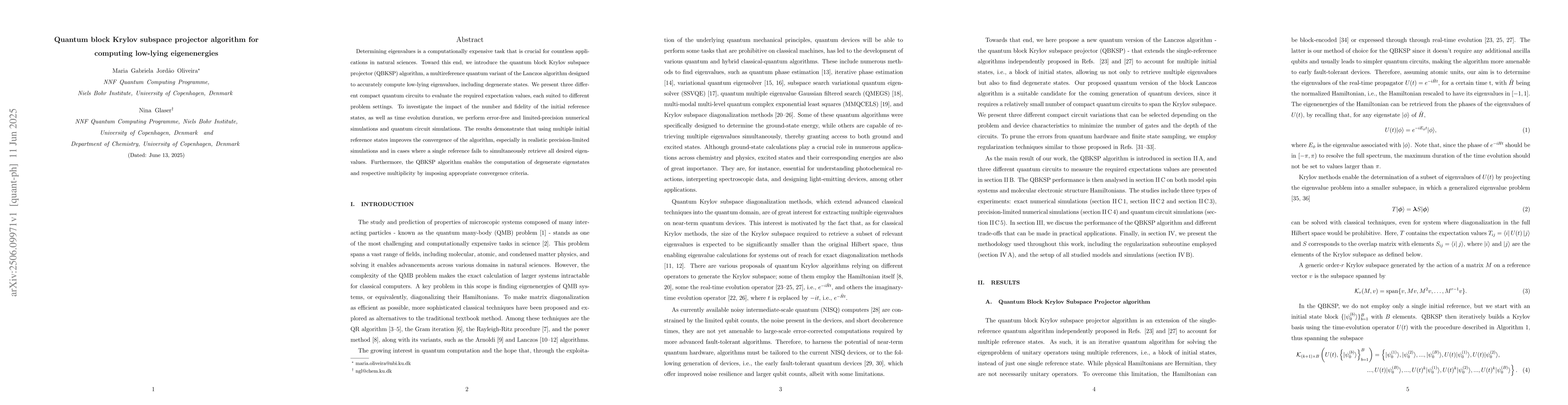 This paper introduces the Quantum Block Krylov Subspace Projector (QBKSP) algorithm, a quantum variant of the Lanczos algorithm. It efficiently computes low-lying eigenvalues, including degenerate states, using multiple reference states and compact quantum circuits. Simulations show improved convergence, especially in precision-limited scenarios and for degenerate eigenstates, with implications for various natural science applications.