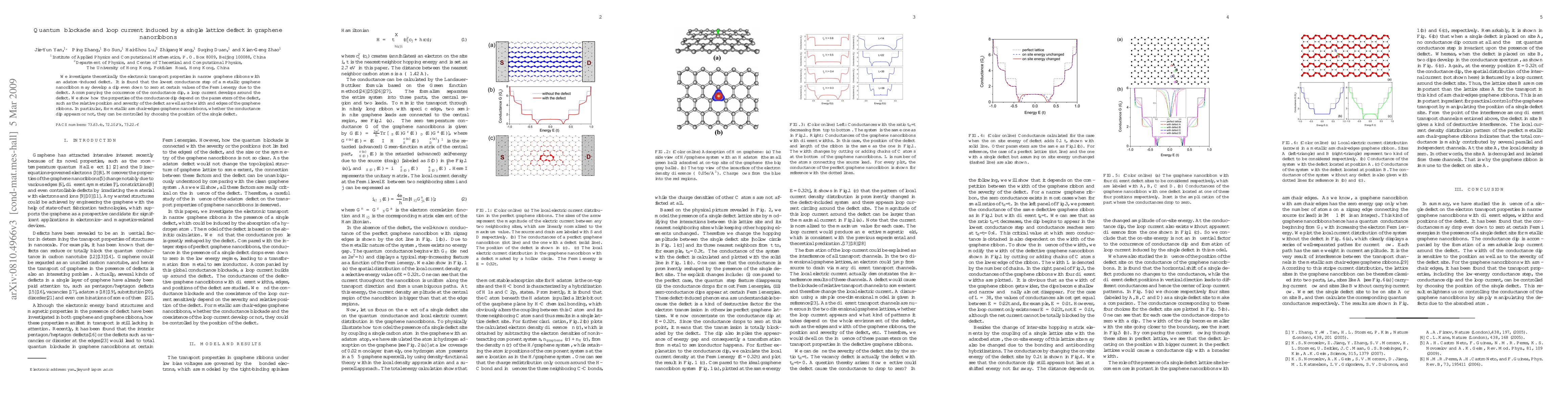 This paper theoretically explores how a single lattice defect in graphene nanoribbons affects electronic transport, finding that the defect can lead to a conductance dip that may reach zero, accompanied by a loop current around the defect. The occurrence and properties of this conductance dip are shown to be dependent on the defect's position and severity, as well as the ribbon's width and edge type.