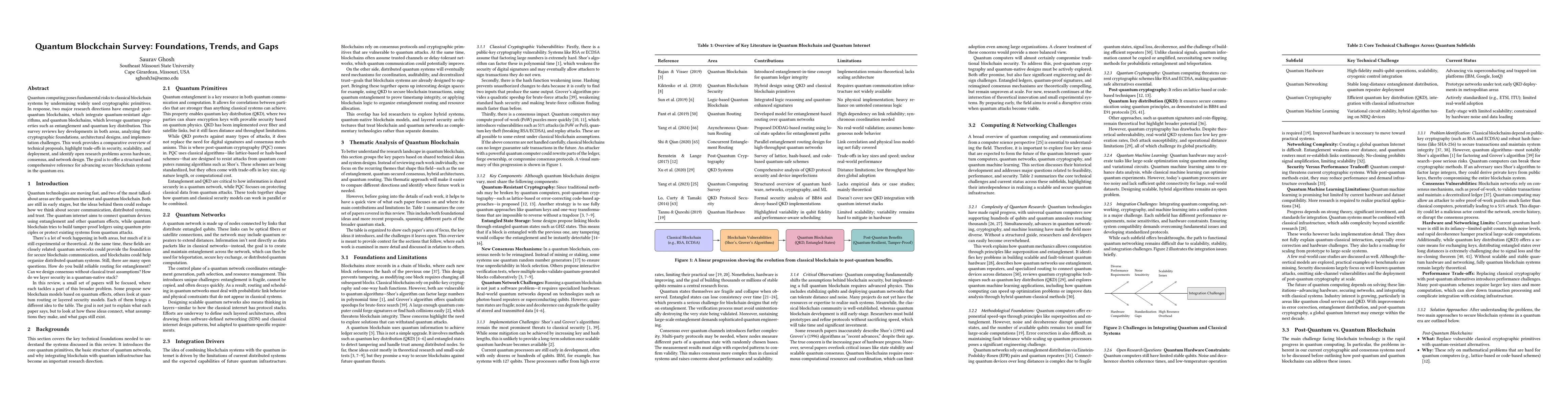 This survey explores quantum blockchain systems, highlighting two main research paths: post-quantum blockchains using quantum-resistant algorithms and quantum blockchains utilizing quantum properties. It compares technical proposals, discusses security-scalability trade-offs, and pinpoints open research problems to advance secure blockchains in the quantum era.