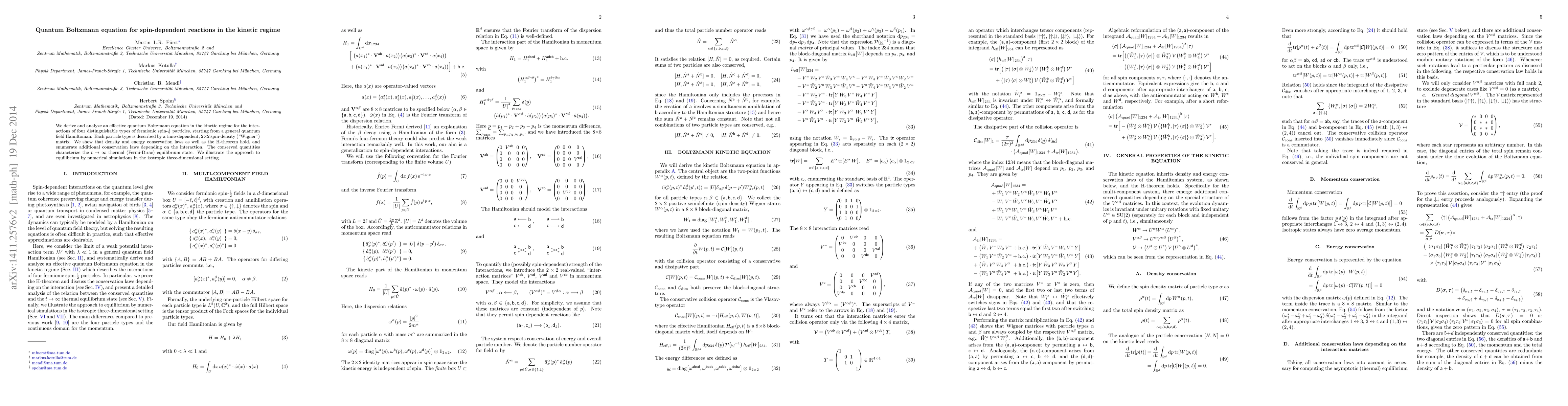 We derive and analyze an effective quantum Boltzmann equation in the kinetic regime for the interactions of four distinguishable types of fermionic spin-$\frac{1}{2}$ particles, starting from a general quantum field Hamiltonian. Each particle type is described by a time-dependent, $2 \times 2$ spin-density ("Wigner") matrix. We show that density and energy conservation laws as well as the H-theorem hold, and enumerate additional conservation laws depending on the interaction. The conserved quantities characterize the $t \to \infty$ thermal (Fermi-Dirac) equilibrium state. We illustrate the approach to equilibrium by numerical simulations in the isotropic three-dimensional setting.