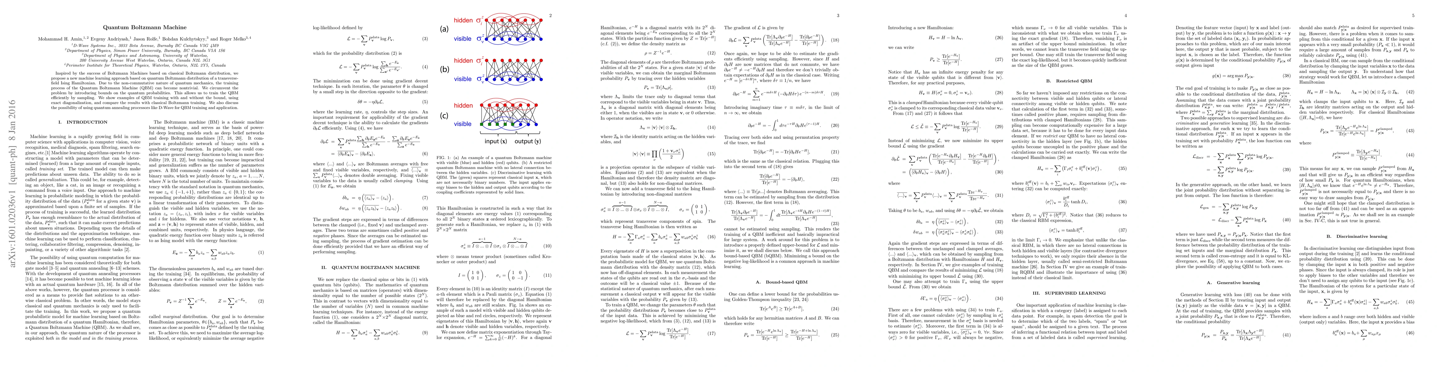 The paper proposes a Quantum Boltzmann Machine (QBM) based on quantum Boltzmann distribution, addressing the training challenge through probability bounds. It demonstrates QBM training efficiency via sampling and compares results with classical Boltzmann methods, also exploring the potential use of quantum annealing processors.