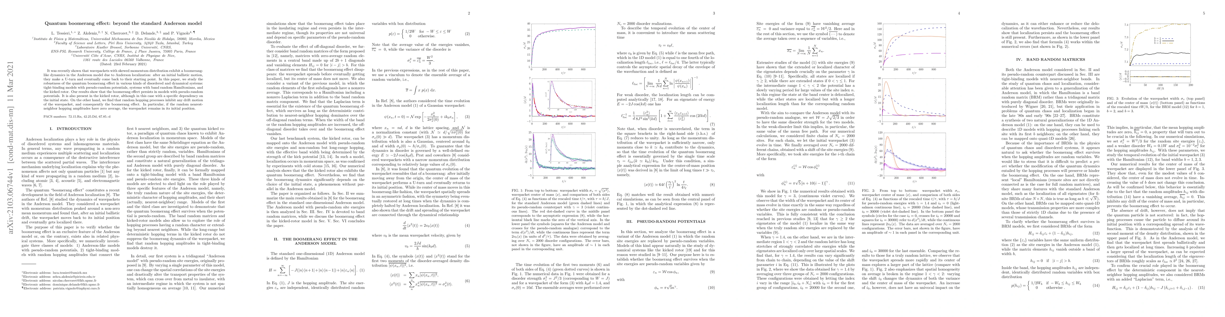 Researchers studied the quantum boomerang effect in various disordered systems, finding that it persists in models with pseudo-random potentials but is inhibited by random hopping processes.