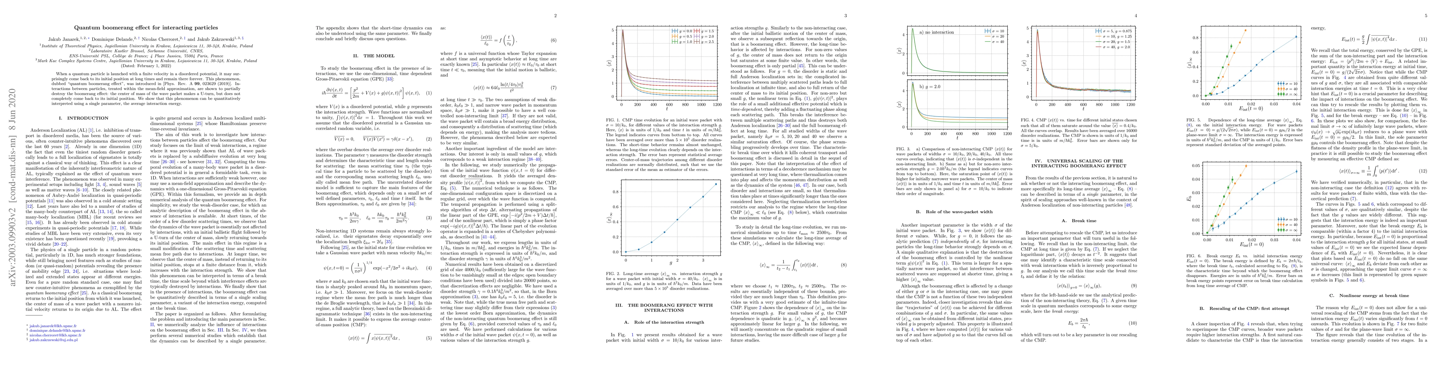 When a quantum particle is launched with a finite velocity in a disordered potential, it may surprisingly come back to its initial position at long times and remain there forever. This phenomenon, dubbed ``quantum boomerang effect'', was introduced in [Phys. Rev. A 99, 023629 (2019)]. Interactions between particles, treated within the mean-field approximation, are shown to partially destroy the boomerang effect: the center of mass of the wave packet makes a U-turn, but does not completely come back to its initial position. We show that this phenomenon can be quantitatively interpreted using a single parameter, the average interaction energy.