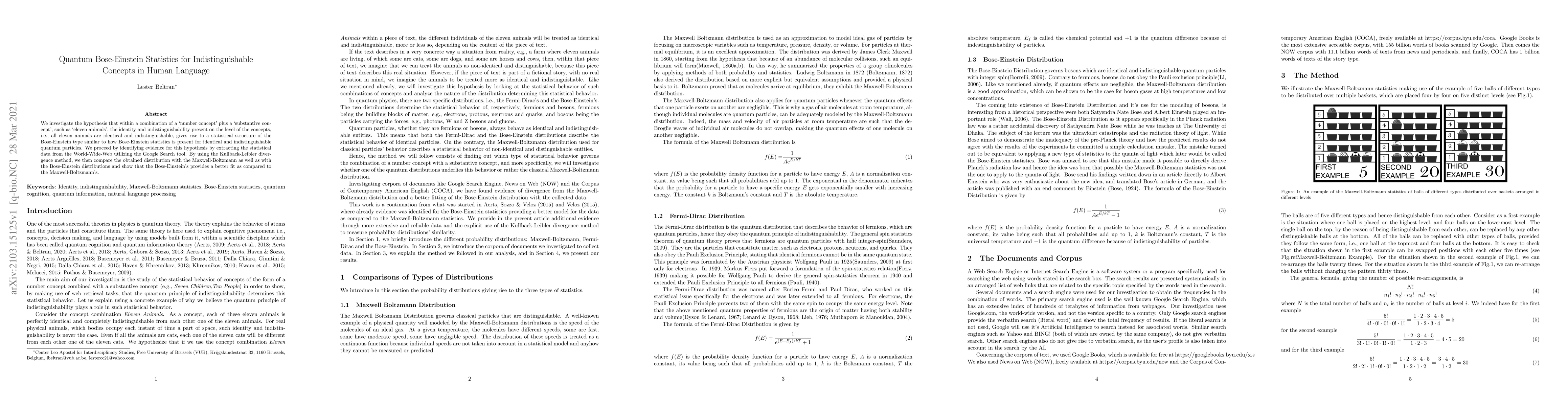 This research explores whether the combination of a 'number concept' and a 'substantive concept' in human language, such as 'eleven animals,' exhibits Bose-Einstein statistical behavior akin to quantum particles. It uses Google Search data and the Kullback-Leibler divergence method to demonstrate that the Bose-Einstein distribution fits the data better than the Maxwell-Boltzmann distribution.