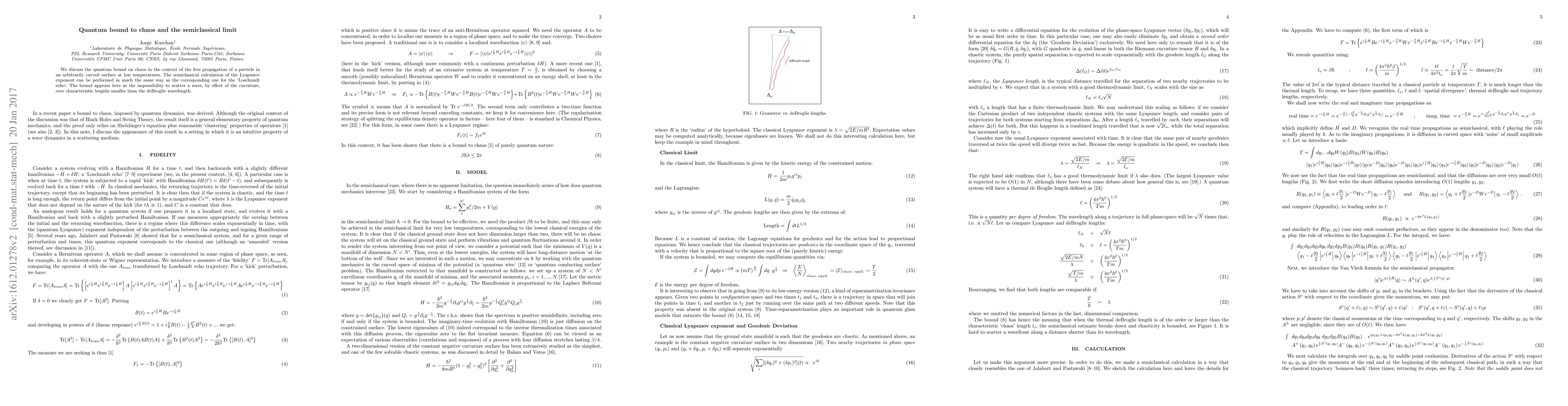 We discuss the quantum bound on chaos in the context of the free propagation of a particle in an arbitrarily curved surface at low temperatures. The semiclassical calculation of the Lyapunov exponent can be performed in much the same way as the corresponding one for the `Loschmidt echo'.The bound appears here as the impossibility to scatter a wave, by effect of the curvature, over characteristic lengths smaller than the deBroglie wavelength.