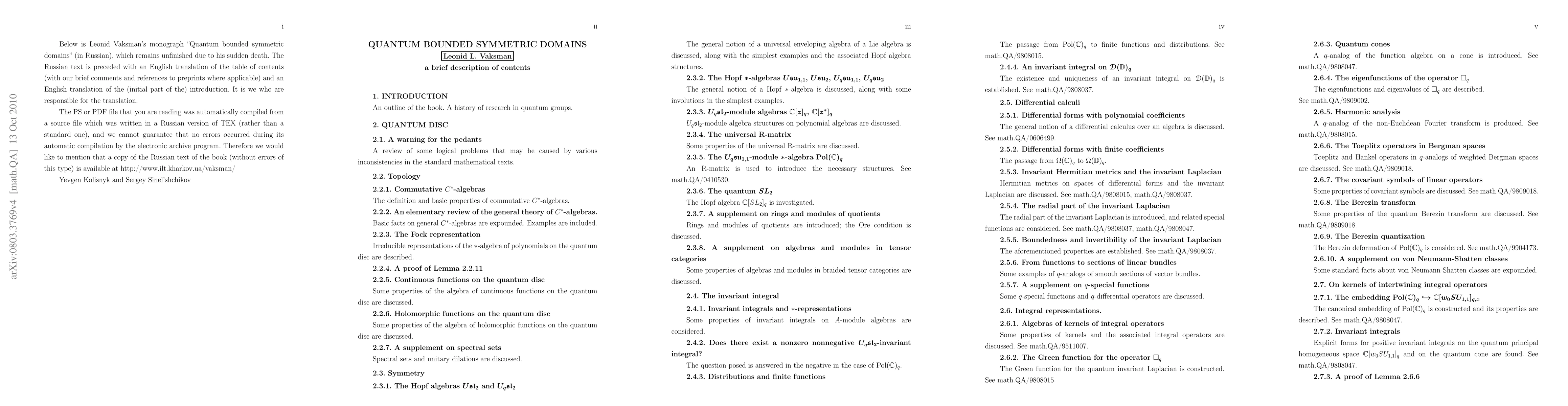 Summary: Leonid Vaksman's monograph explores quantum bounded symmetric domains, offering insights into noncommutative complex analysis and serving as an example for the study of subalgebras of C*-algebras, a field initiated by W. Arveson. The work includes an English translation of the table of contents and part of the introduction.
