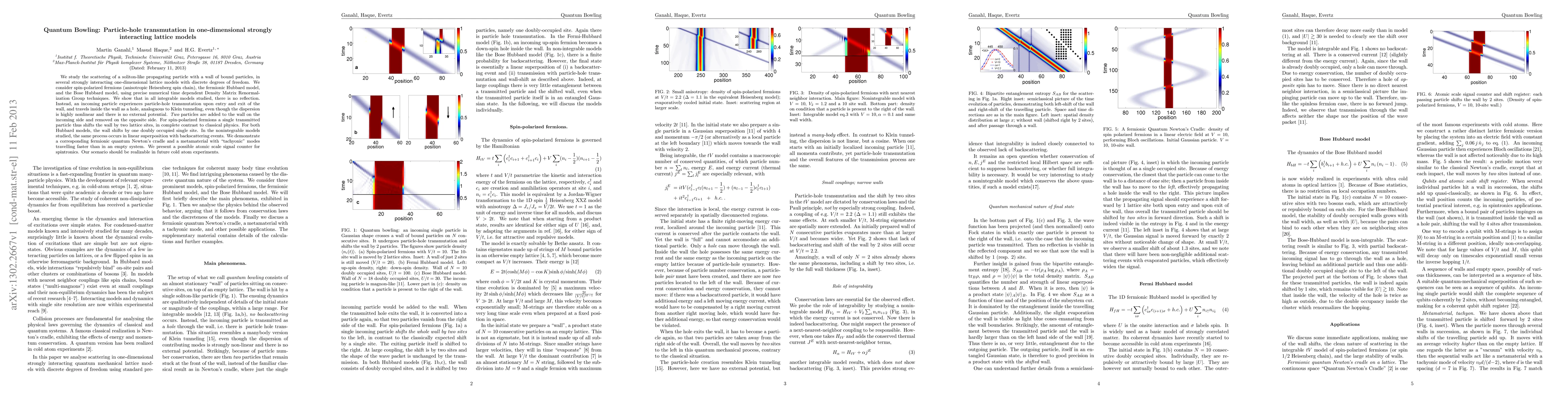 We study the scattering of a soliton-like propagating particle with a wall of bound particles, in several strongly interacting one-dimensional lattice models with discrete degrees of freedom. We consider spin-polarized fermions (anisotropic Heisenberg spin chain), the fermionic Hubbard model, and the Bose Hubbard model, using precise numerical time dependent Density Matrix Renormalization Group techniques. We show that in all integrable models studied, there is no reflection. Instead, an incoming particle experiences particle-hole transmutation upon entry and exit of the wall, and travels inside the wall as a hole, analoguous to Klein tunneling, even though the dispersion is highly nonlinear and there is no external potential. {\em Two} particles are added to the wall on the incoming side and removed on the opposite side. For spin-polarized fermions a single transmitted particle thus shifts the wall by two lattice sites, in complete contrast to classical physics. For both Hubbard models, the wall shifts by one doubly occupied single site. In the nonintegrable models studied, the same process occurs in linear superposition with backscattering events. We demonstrate a corresponding fermionic quantum Newton's cradle and a metamaterial with "tachyonic" modes travelling faster than in an empty system. We present a possible atomic scale signal counter for spintronics. Our scenario should be realizable in future cold atom experiments.