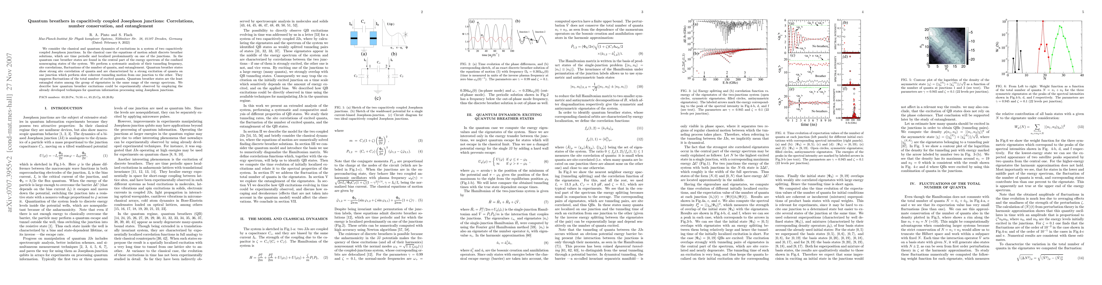 This paper investigates the dynamics of excitations in capacitively coupled Josephson junctions, identifying quantum breather states characterized by strong site correlations and minimal entanglement. These states exhibit slow coherent tunneling and suppress fluctuations in the total number of quanta.