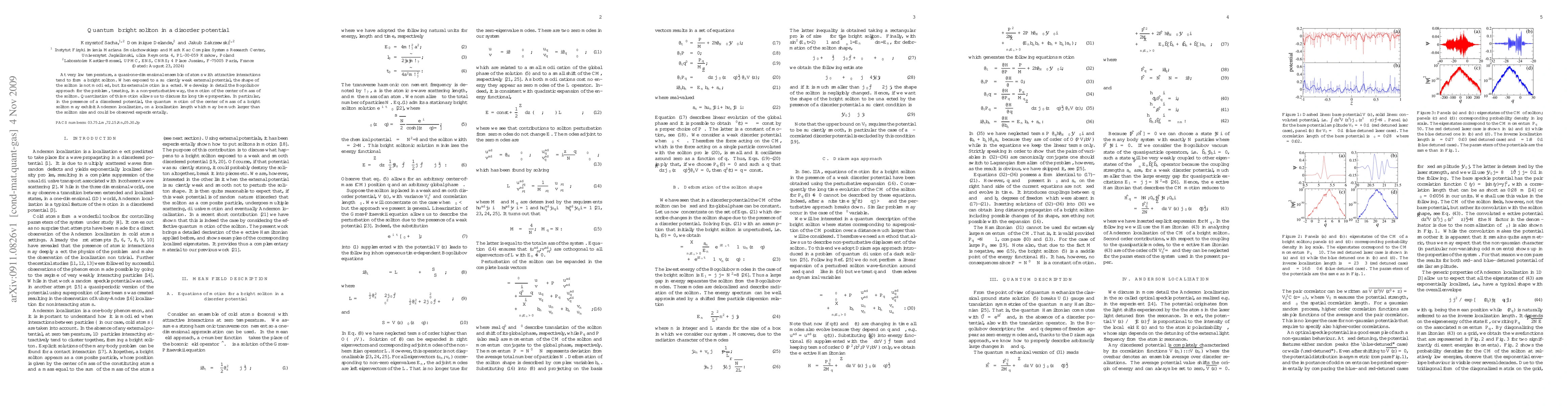 This paper investigates the formation and behavior of a quantum bright soliton in a quasi-one-dimensional ensemble of atoms under attractive interactions, particularly focusing on its response to disorder potentials. The study employs the Bogoliubov approach, revealing that the soliton's shape remains unchanged but its motion is affected, potentially leading to Anderson localization in disordered environments.