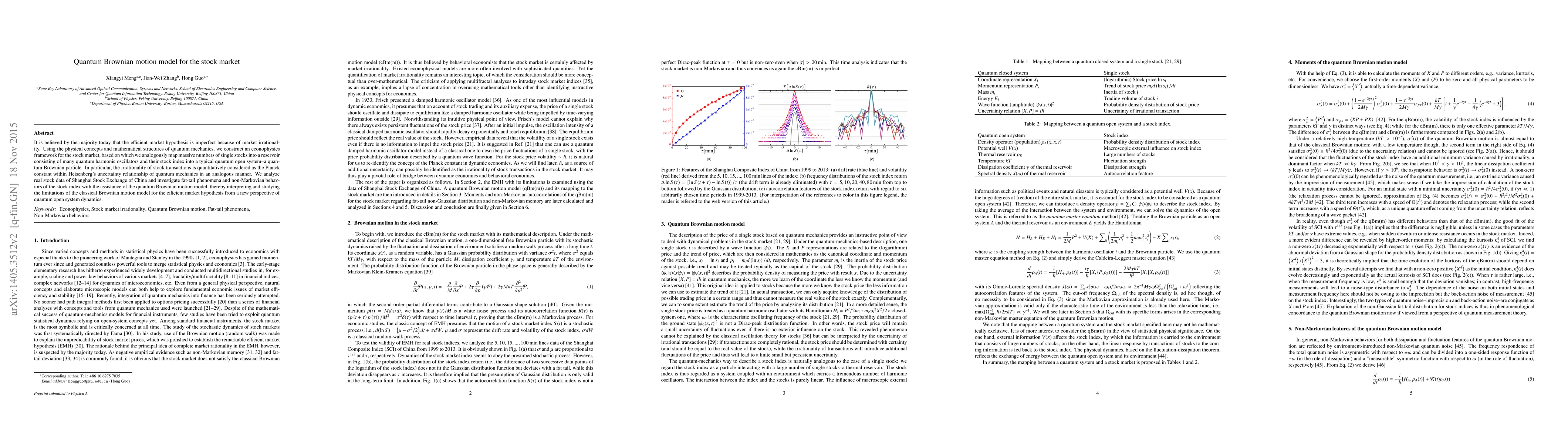 It is believed by the majority today that the efficient market hypothesis is imperfect because of market irrationality. Using the physical concepts and mathematical structures of quantum mechanics, we construct an econophysics framework for the stock market, based on which we analogously map massive numbers of single stocks into a reservoir consisting of many quantum harmonic oscillators and their stock index into a typical quantum open system--a quantum Brownian particle. In particular, the irrationality of stock transactions is quantitatively considered as the Planck constant within Heisenberg's uncertainty relationship of quantum mechanics in an analogous manner. We analyze real stock data of Shanghai Stock Exchange of China and investigate fat-tail phenomena and non-Markovian behaviors of the stock index with the assistance of the quantum Brownian motion model, thereby interpreting and studying the limitations of the classical Brownian motion model for the efficient market hypothesis from a new perspective of quantum open system dynamics.