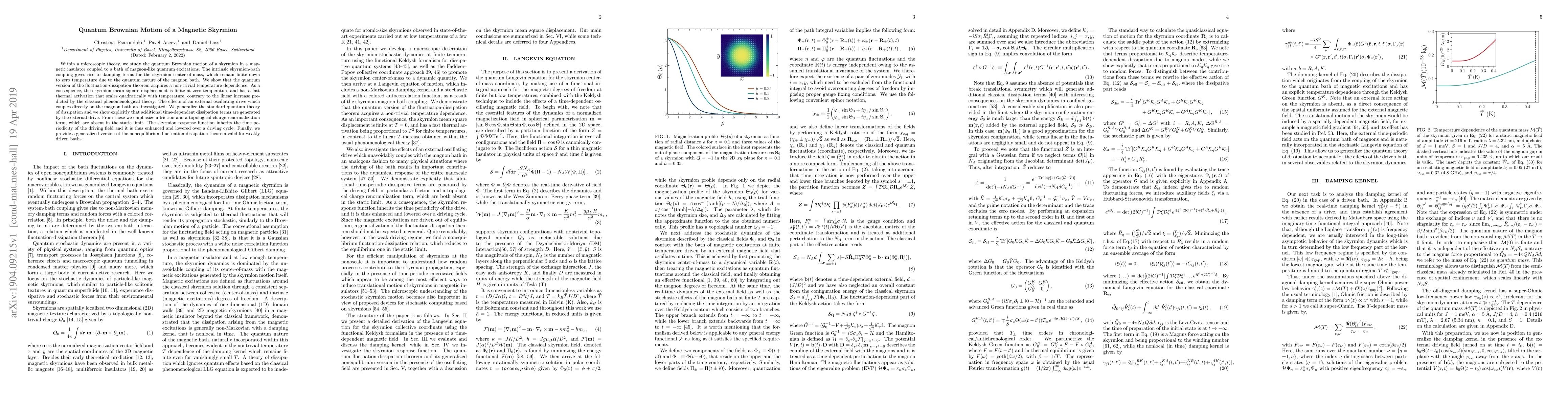 This study investigates the quantum Brownian motion of a magnetic skyrmion in a magnetic insulator, revealing finite mean square displacement at zero temperature with a fast thermal activation that scales quadratically with temperature.