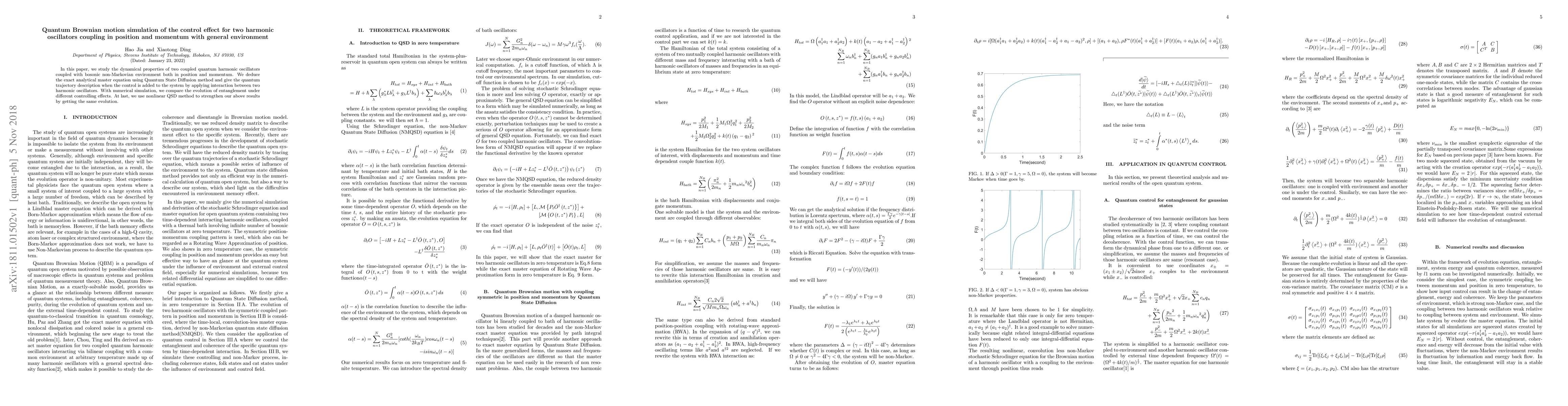 In this paper, we study the dynamical properties of two coupled quantum harmonic oscillators coupled with bosonic non-Markovian environment both in position and momentum. We deduce the exact analytical master equation using Quantum State Diffusion method and give the quantum trajectory description when the control is added to the system by applying interaction between two harmonic oscillators. With numerical simulation, we compare the evolution of entanglement under different controlling effects. At last, we use nonlinear Quantum State Diffusion method to strengthen our above results by getting the same evolution.