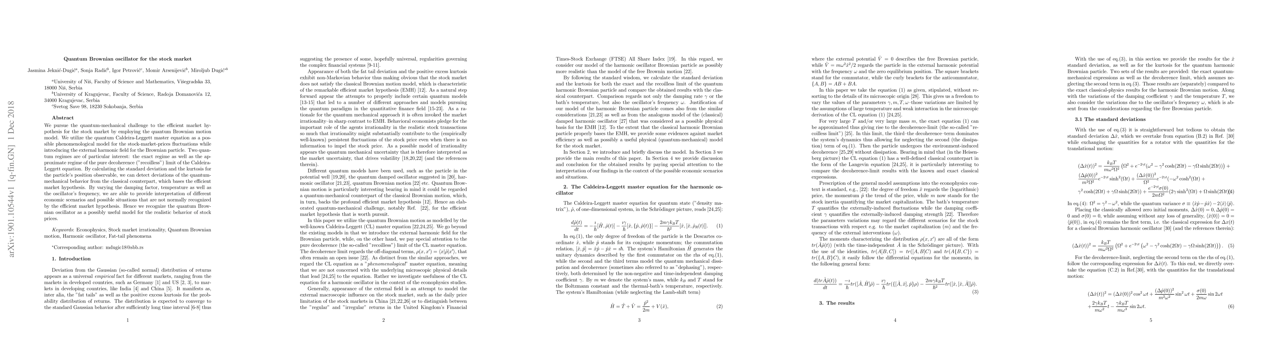 We pursue the quantum-mechanical challenge to the efficient market hypothesis for the stock market by employing the quantum Brownian motion model. We utilize the quantum Caldeira-Leggett master equation as a possible phenomenological model for the stock-market-prices fluctuations while introducing the external harmonic field for the Brownian particle. Two quantum regimes are of particular interest: the exact regime as well as the approximate regime of the pure decoherence ("recoilless") limit of the Caldeira-Leggett equation. By calculating the standard deviation and the kurtosis for the particle's position observable, we can detect deviations of the quantum-mechanical behavior from the classical counterpart, which bases the efficient market hypothesis. By varying the damping factor, temperature as well as the oscillator's frequency, we are able to provide interpretation of different economic scenarios and possible situations that are not normally recognized by the efficient market hypothesis. Hence we recognize the quantum Brownian oscillator as a possibly useful model for the realistic behavior of stock prices.