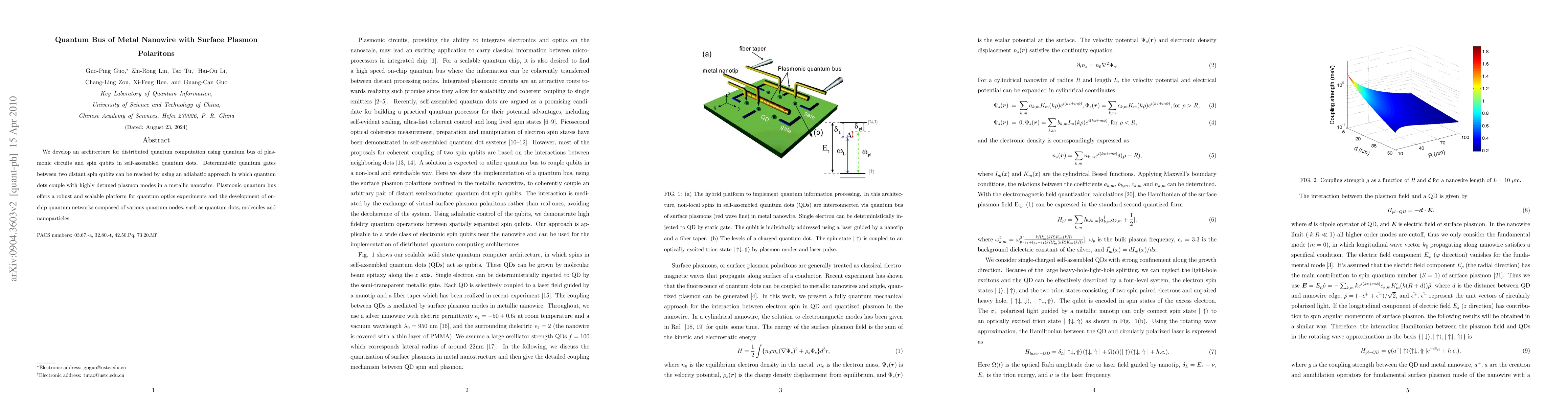 This paper proposes a quantum bus architecture using plasmonic circuits and spin qubits in quantum dots for distributed quantum computation, achieving deterministic quantum gates via adiabatic coupling with plasmon modes in a metallic nanowire. The plasmonic quantum bus is presented as a scalable and robust platform for quantum optics and on-chip quantum networks.