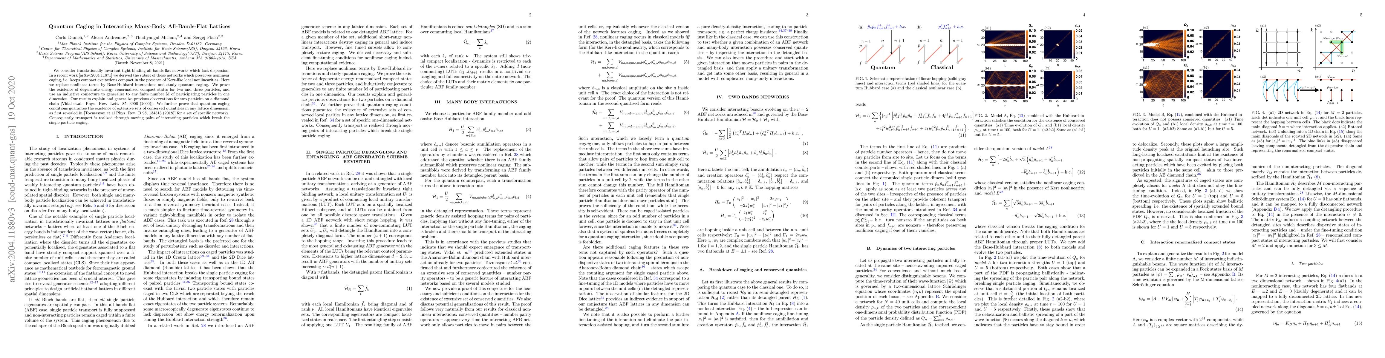 We consider translationally invariant tight-binding all-bands-flat networks which lack dispersion. In a recent work [arXiv:2004.11871] we derived the subset of these networks which preserves nonlinear caging, i.e. keeps compact excitations compact in the presence of Kerr-like local nonlinearities. Here we replace nonlinear terms by Bose-Hubbard interactions and study quantum caging. We prove the existence of degenerate energy renormalized compact states for two and three particles, and use an inductive conjecture to generalize to any finite number M of participating particles in one dimension. Our results explain and generalize previous observations for two particles on a diamond chain [Vidal et.al. Phys. Rev. Lett. 85, 3906 (2000)]. We further prove that quantum caging conditions guarantee the existence of extensive sets of conserved quantities in any lattice dimension, as first revealed in [Tovmasyan et al Phys. Rev. B 98, 134513 (2018)] for a set of specific networks. Consequently transport is realized through moving pairs of interacting particles which break the single particle caging.