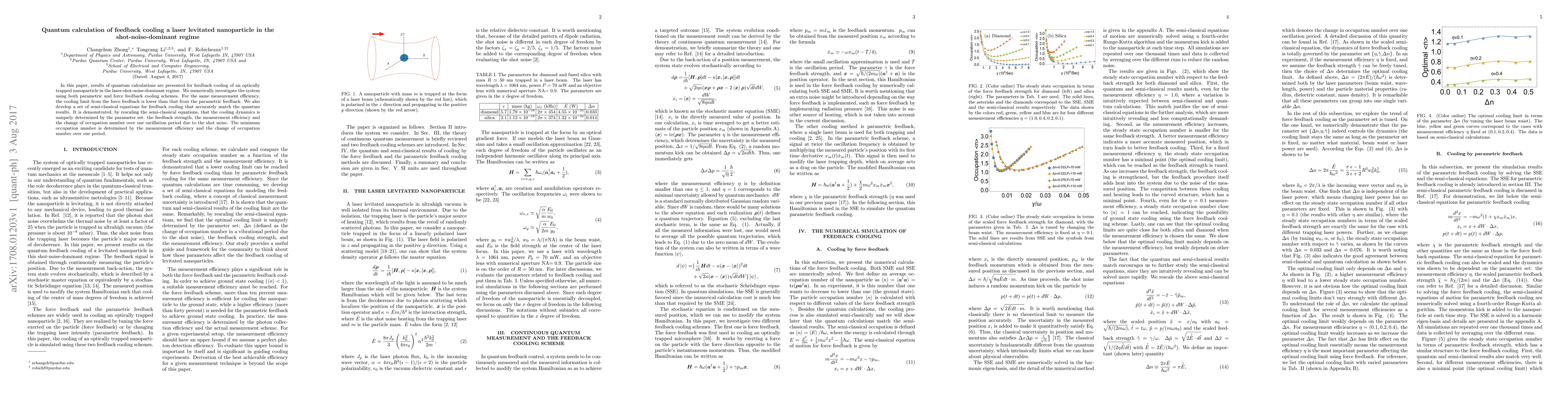In this paper, results of quantum calculations are presented for feedback cooling of an optically trapped nanoparticle in the laser-shot-noise-dominant regime. We numerically investigate the system using both parametric and force feedback cooling schemes. For the same measurement efficiency, the cooling limit from the force feedback is lower than that from the parametric feedback. We also develop a set of semi-classical equations for feedback cooling that accurately match the quantum results. It is demonstrated, by rescaling the semi-classical equations, that the cooling dynamics is uniquely determined by the parameter set: the feedback strength, the measurement efficiency and the change of occupation number over one oscillation period due to the shot noise. The minimum occupation number is determined by the measurement efficiency and the change of occupation number over one period.