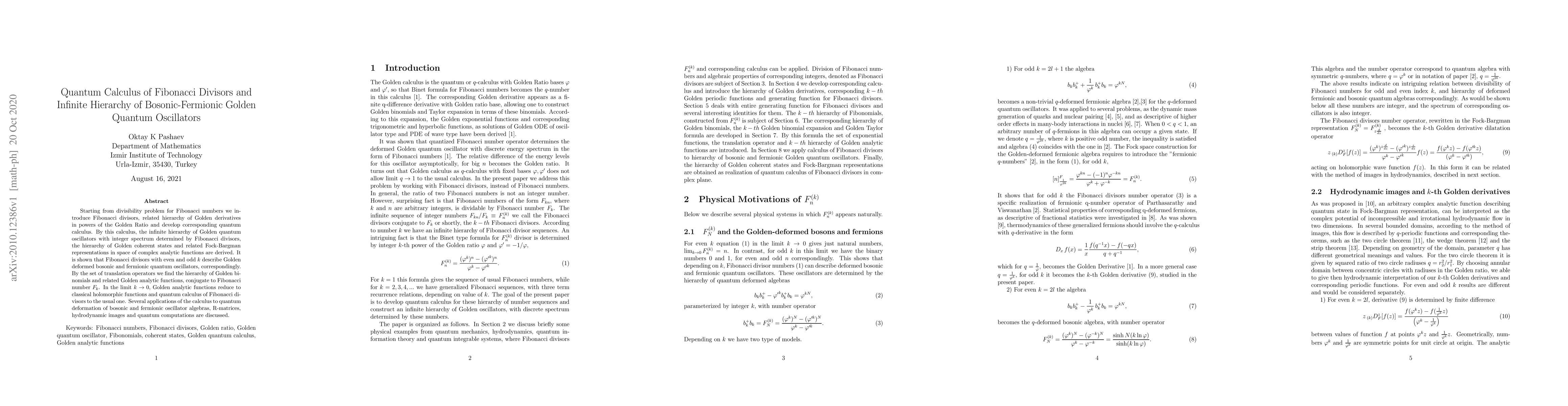 Starting from divisibility problem for Fibonacci numbers we introduce Fibonacci divisors, related hierarchy of Golden derivatives in powers of the Golden Ratio and develop corresponding quantum calculus. By this calculus, the infinite hierarchy of Golden quantum oscillators with integer spectrum determined by Fibonacci divisors, the hierarchy of Golden coherent states and related Fock-Bargman representations in space of complex analytic functions are derived. It is shown that Fibonacci divisors with even and odd $k$ describe Golden deformed bosonic and fermionic quantum oscillators, correspondingly. By the set of translation operators we find the hierarchy of Golden binomials and related Golden analytic functions, conjugate to Fibonacci number $F_k$. In the limit k -> 0, Golden analytic functions reduce to classical holomorphic functions and quantum calculus of Fibonacci divisors to the usual one. Several applications of the calculus to quantum deformation of bosonic and fermionic oscillator algebras, R-matrices, hydrodynamic images and quantum computations are discussed.