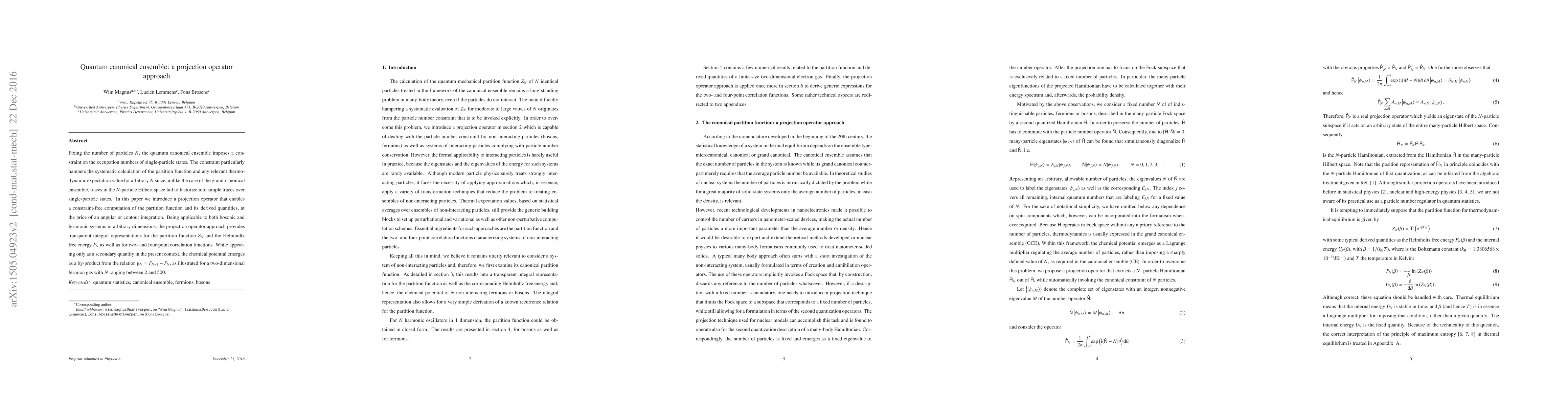 Fixing the number of particles $N$, the quantum canonical ensemble imposes a constraint on the occupation numbers of single-particle states. The constraint particularly hampers the systematic calculation of the partition function and any relevant thermodynamic expectation value for arbitrary $N$ since, unlike the case of the grand-canonical ensemble, traces in the $N$-particle Hilbert space fail to factorize into simple traces over single-particle states. In this paper we introduce a projection operator that enables a constraint-free computation of the partition function and its derived quantities, at the price of an angular or contour integration. Being applicable to both bosonic and fermionic non-interacting systems in arbitrary dimensions, the projection operator approach provides closed-form expressions for the partition function $Z_N$ and the Helmholtz free energy $F_{\! N}$ as well as for two- and four-point correlation functions. While appearing only as a secondary quantity in the present context, the chemical potential potential emerges as a by-product from the relation $\mu_N = F_{\! N+1} - F_{\! N}$, as illustrated for a two-dimensional fermion gas with $N$ ranging between 2 and 500.