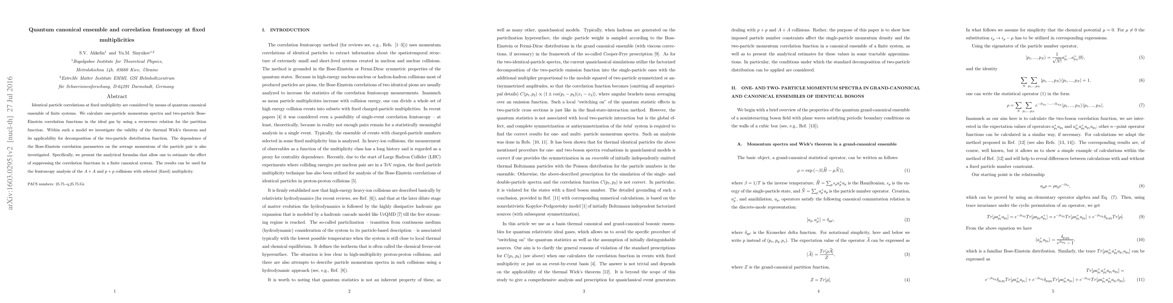 This paper explores identical particle correlations at fixed multiplicities using a quantum canonical ensemble for finite systems, calculating momentum spectra and two-particle Bose-Einstein correlation functions. It investigates the thermal Wick's theorem's validity and the dependence of correlation parameters on average momentum, providing analytical formulas for estimating correlation suppression effects in finite systems, useful for femtoscopy analysis in high-energy collisions.