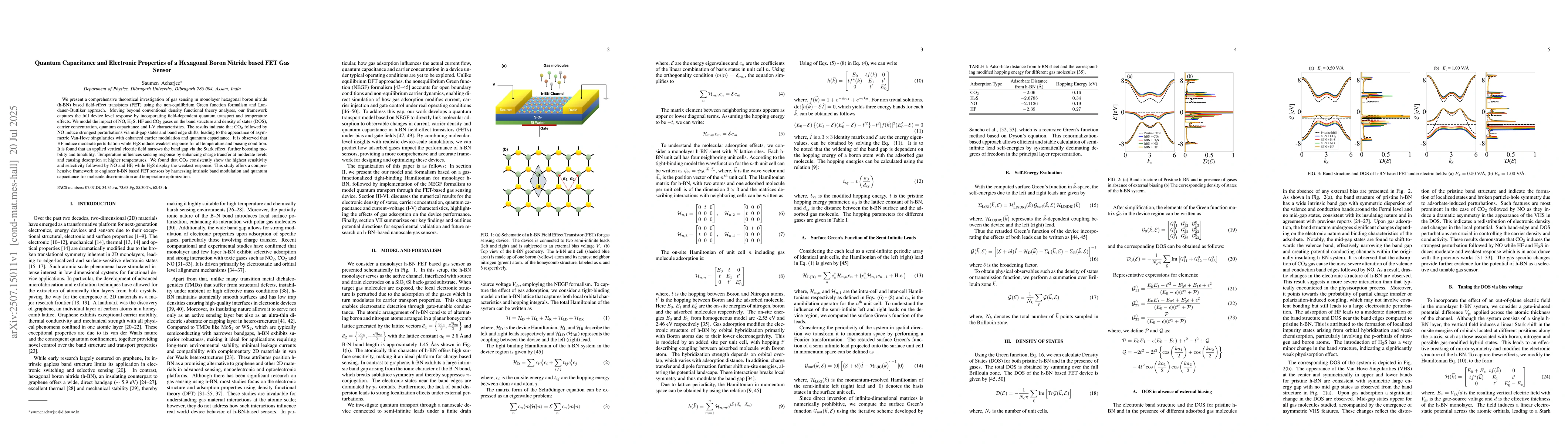 Extends previous DFT-based studies by providing a full device-level perspective on gas sensing in h-BN based FETs, including gate-tunable I-V characteristics, quantum capacitance variation, and temperature-dependent sensitivity.